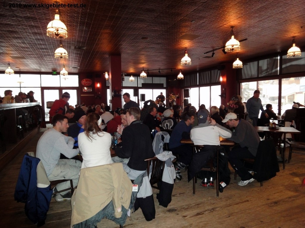 American apres-ski is quite a bit different from the Alp-parties in Europe. But that doesn’t mean that they don’t know how to end a hard day of skiing on a high note. The spots to hit after 3pm in Center Village are Jack’s Bar and Endo’s Adrenaline Cafe. Jack’s Bar is your typical American sports bar. Order a burger or sandwich and watch the game on a big screen tv. Live music is offered Wednesday through Saturday. East Village is another great place to top off the long day. We especially like JJ’s Tavern, where they have live country and blue grass bands. For a meal between runs you’ve got three choices: burgers and pizzas at Solitude Station BBQ (at the upper terminal of the American Eagle lift) or the T-Rex Grill (at the base terminal of the Timberline Express) or some lighter fare at Flyers Soup Shack.