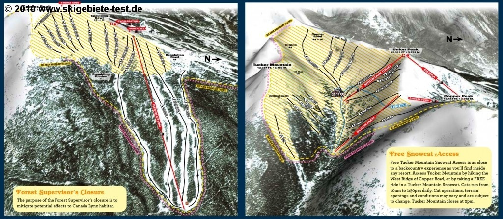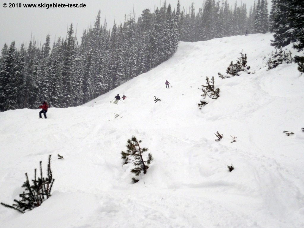 As we mentioned in the Beginners category, the terrain below the 12,441 ft (3792m) Copper Peak has an advantage when compared to the rest of the terrain. Whereas the massif in the western part flattens out pretty quickly, creating the perfect foundation for beginners’ slopes, the east is characterized by rocky passages and, in the lower part, steep tree-skiing slopes. The runs off of the chairlifts Resolution, Alpine and Super Bee are almost exclusively black diamonds and double diamonds. Freeriders, glade skiing fans and all other types of extreme skiers will pretty much have the area to themselves. And if you’re still not satisfied, you’ll find the ultimate backcountry experience just south of Union Peak (12,313ft/3753m) at the base terminal of the Mountain Chief chairlift. Skiers are taken up to the flanks of the 12,336 foot (3760m) high Tucker Mountain on a snowcat. The runs off there are extremely challenging with steep rocky passages leading through forested ground back to the chairlifts. There are only two reasons Copper Mountain couldn’t receive the highest possible rating in this category – the lifts just weren’t up to European standards and the selection of difficult trails wouldn’t suffice for a vacation of more than a couple days.