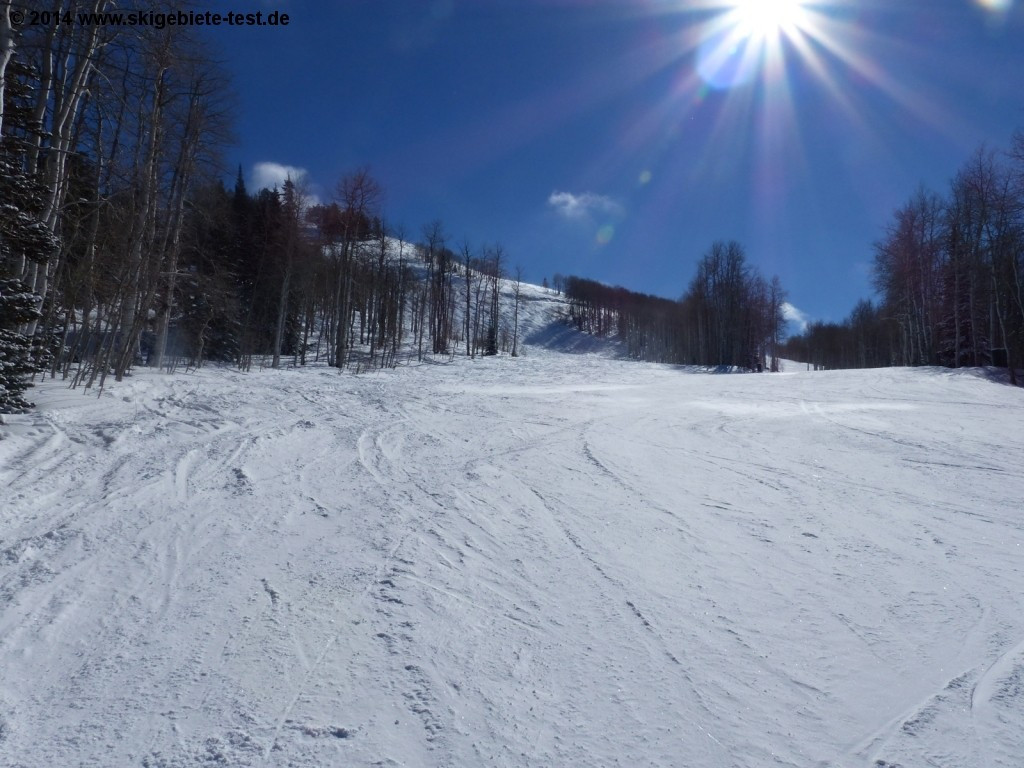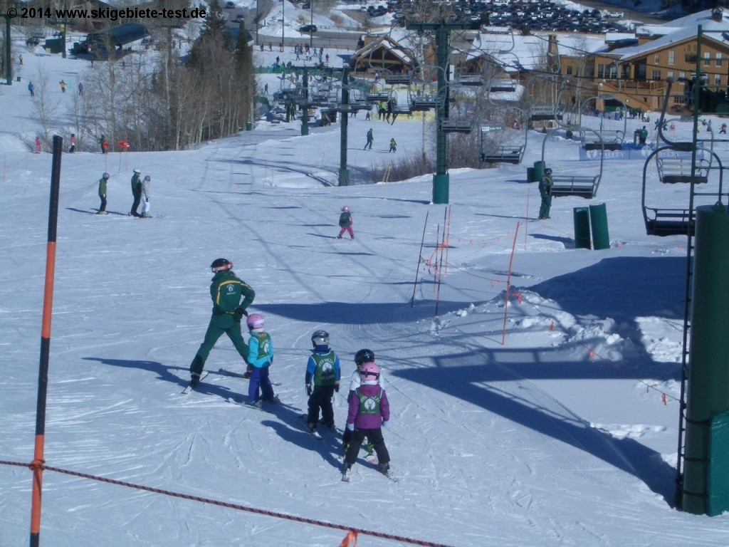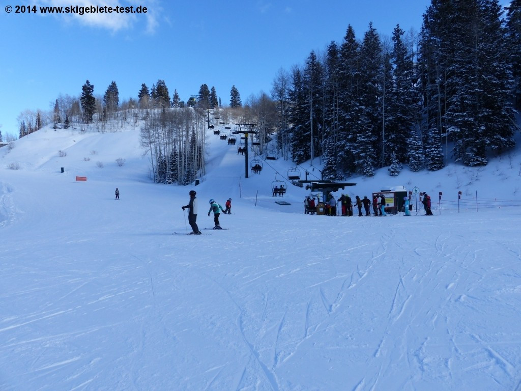 Deer Valley Resort offers easy first steps into alpine skiing with 26km (221ha) of ski trails in the lightest category. In the US, easy ski-runs are marked with a green dot. These slopes are spread all over the skiing area so that beginners may gain a complete overview of the entire resort. Most of the slopes suitable for beginners can be found around the 2,774m (9,100ft) high Flagstaff Mountain. The runs below the three 4-seater chairlifts Silver Strike Express, Northside Express and Ruby Express are highly recommendable. There are trails labeled with a blue square, such as Lost Boulder, Hawkeye, Lucky Star or Sidewinder (see slope map). According to American standards, this group of slopes can be categorized as intermediate but the runs are well groomed and only slightly tilted, making them perfectly suitable for beginners. The green marked Success run down to the 4-seater chairlift Carpenter Express at the Snow Park Lodge or the Deer Hollow slope down to the Mountaineer Express at the Little Baldy Peak (2,423m/ 7,950ft) are well suitable to exercise one's ski skills.
