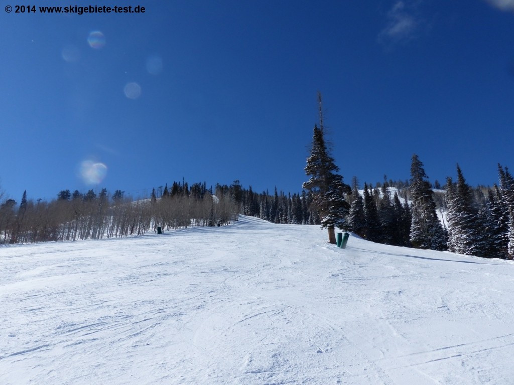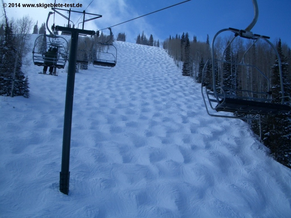 At Deer Valley, the slopes in the advanced or expert category are marked with single or double diamonds. Rarely are they groomed or only every other day and are therefore the best choice for lovers of mogul runs. Most ski-runs of the difficult category can be found on Bald Mountain, reaching a height of 2,865m (9,400ft) altitude. Especially Orient Express, Narrow Gauge or Morning Star, all directed towards the north and located next to the 3-seater chairlifts Mayflower, will challenge even a very advanced skier. The many bumps, humps and peaks of Reward and Ratter, both leading to the 4-seater chairlift Wasatch Express, are bound to be liked by expert skiers as they provide an extra dose of challenge and excitement. For all lovers of the light and fluffy powder Utah is internationally known for, the avalanche controlled powder snow slopes of Ontario Bowl, located at the northern flank of Flagstaff Mountain, or Daly Bowl and Daly Chutes, both located at the ridge of Empire Mountain, are highly recommended. In order to fully use the powder, one needs to walk a little to get to the deep powder snow areas.