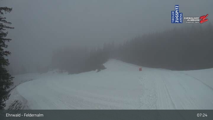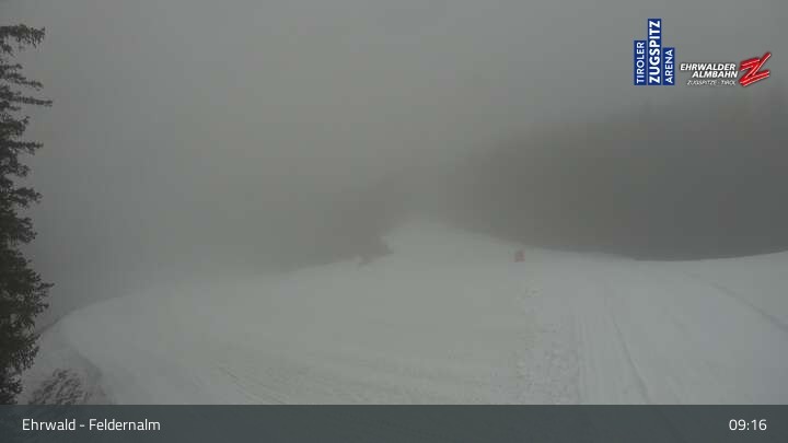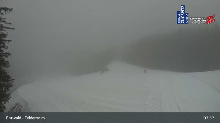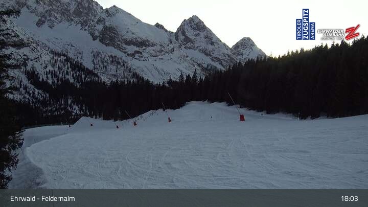 The webcam shows the surroundings of the Feldernalm in the skiing area Ehrwald at Tiroler Zugspitzarena.