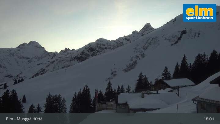 Archived webcam image showing Elm: Munggä Hüttä on 26 Feb 2026 at 19:12 18:00