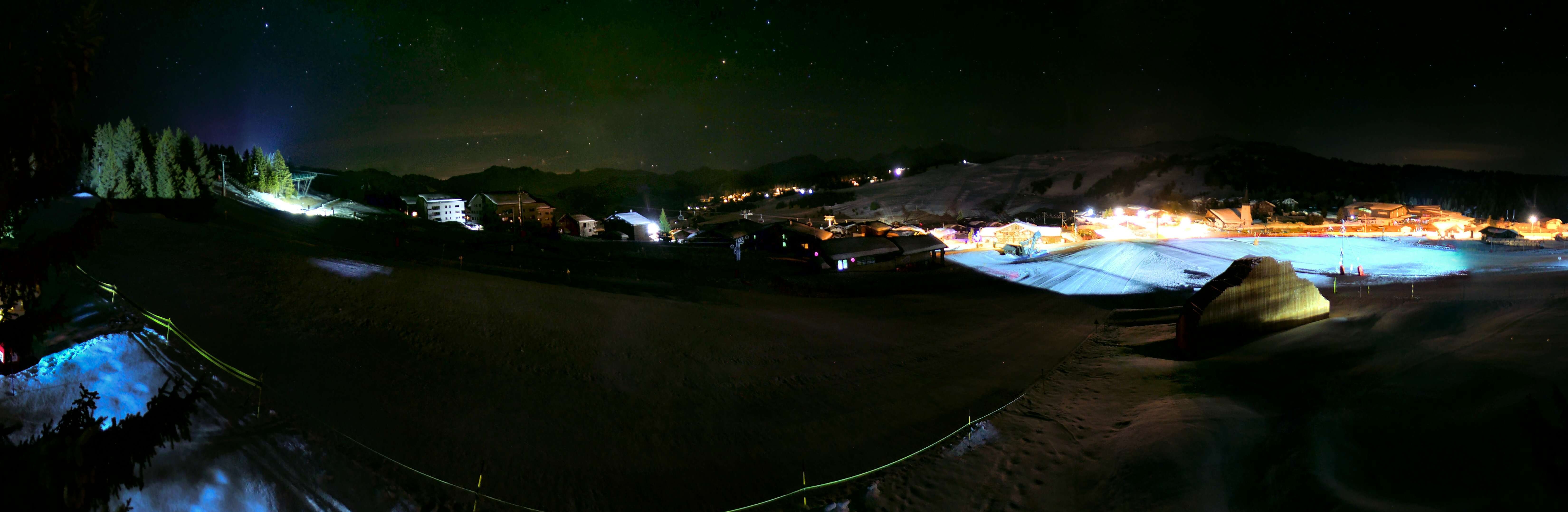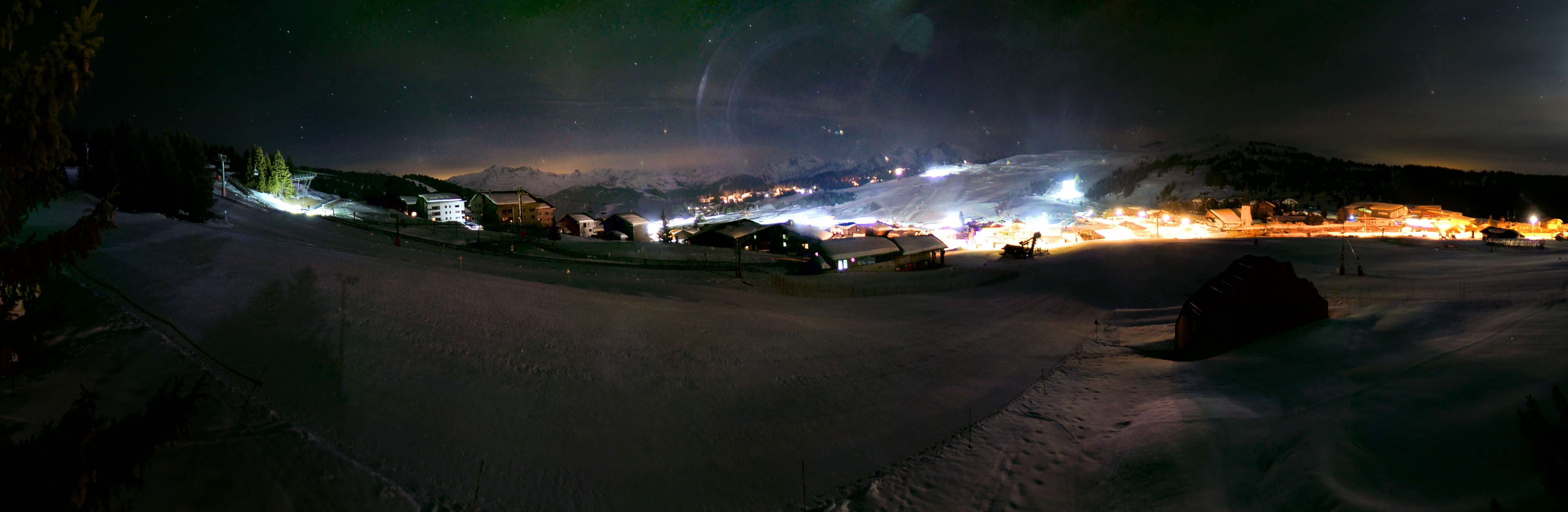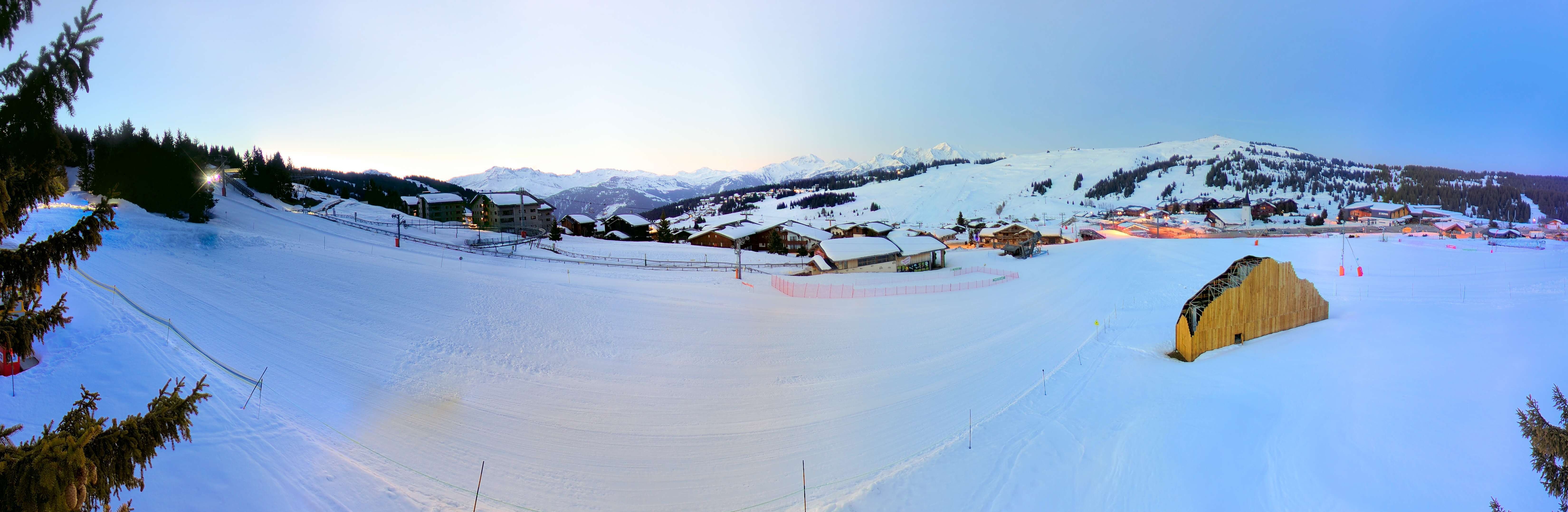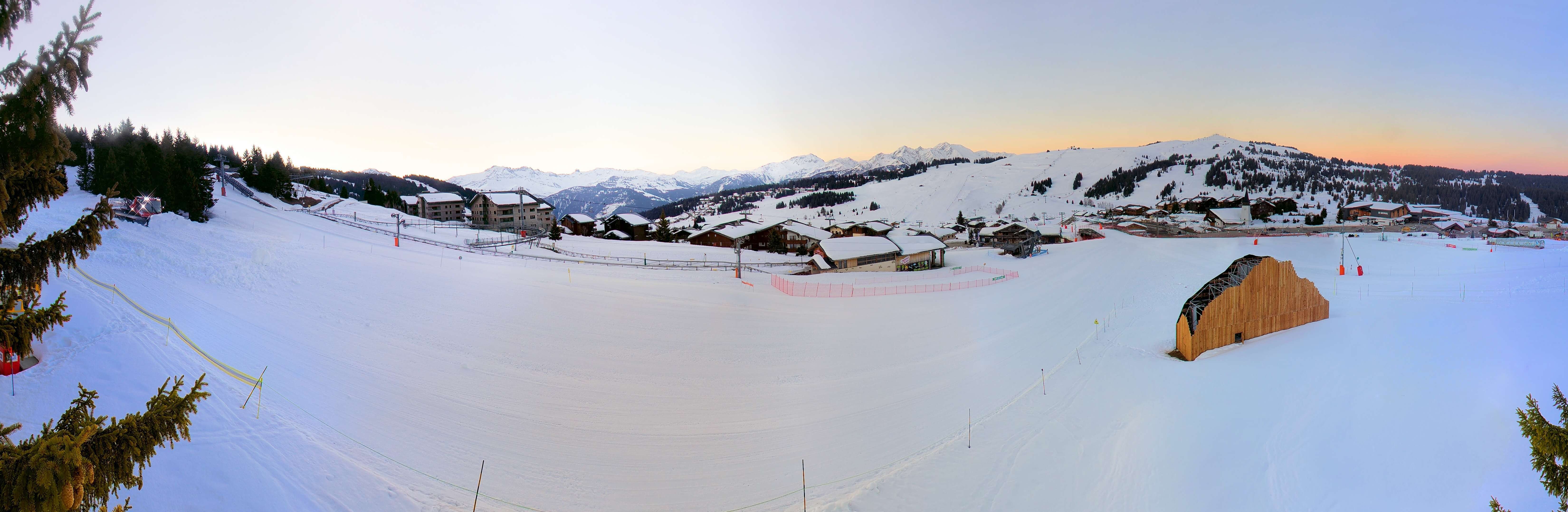 From the square Erwin Eckl the webcam provides a panoramic view of french village Les Saisies. Two chairlifts are running right over the village.