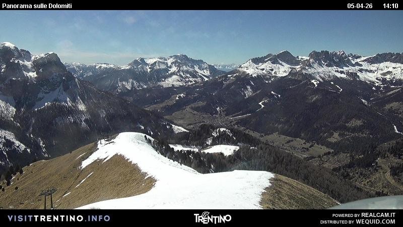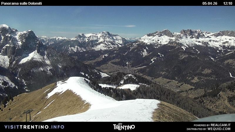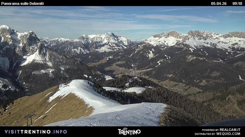 The webcam shows the view from Buffaure towards Vigo di Fassa. One can spot the street, that leads to pass and lake Karer. In the back, the Latemar mountain chain on the right and the Rosengarten mountain cahin in the left are visible.