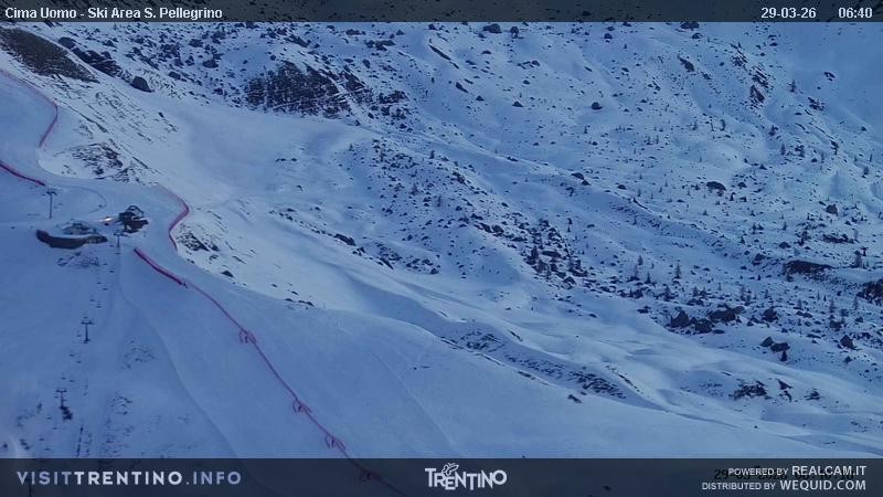 View from Col Margherita towards slopes and lifts of San Pellegrino Pass in italian Valley Fassa. From the pass, one can spot the peaks of Costabella an Cima Uomo.