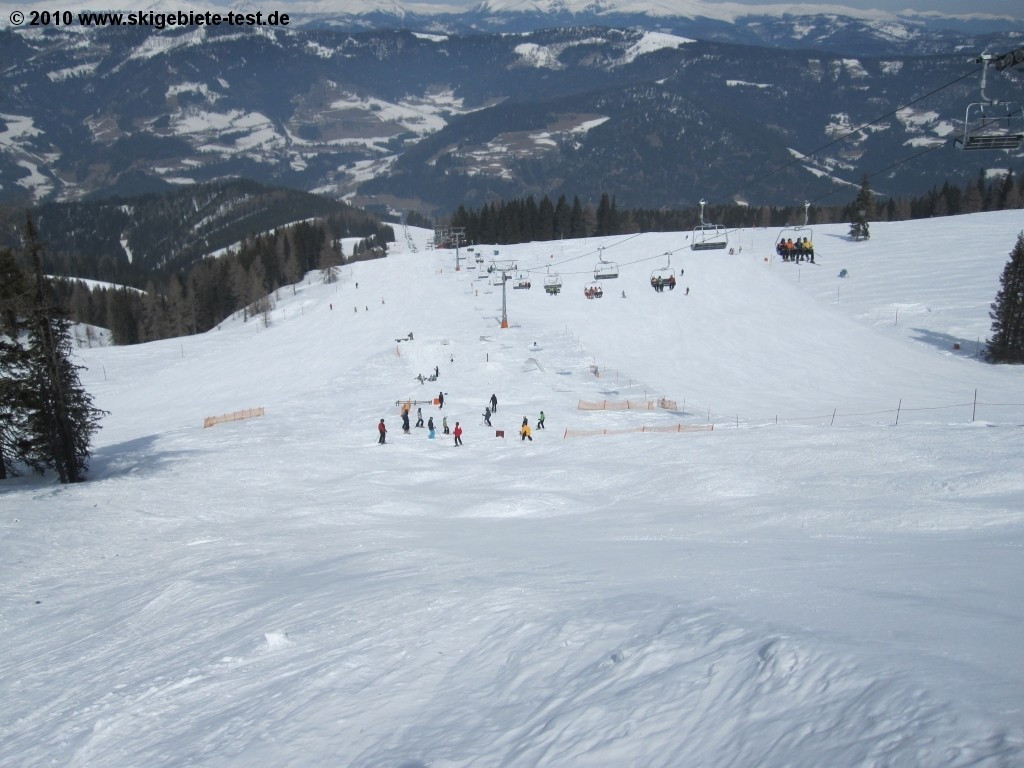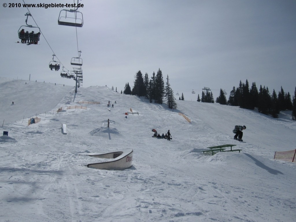 For freestylers there’s a small terrain park at the Kanzelhöhe. Though the park is equipped with quite a few small kickers, rails, tables, a curved box and a straight box, it’s nothing that will blow more experienced freestylers away.