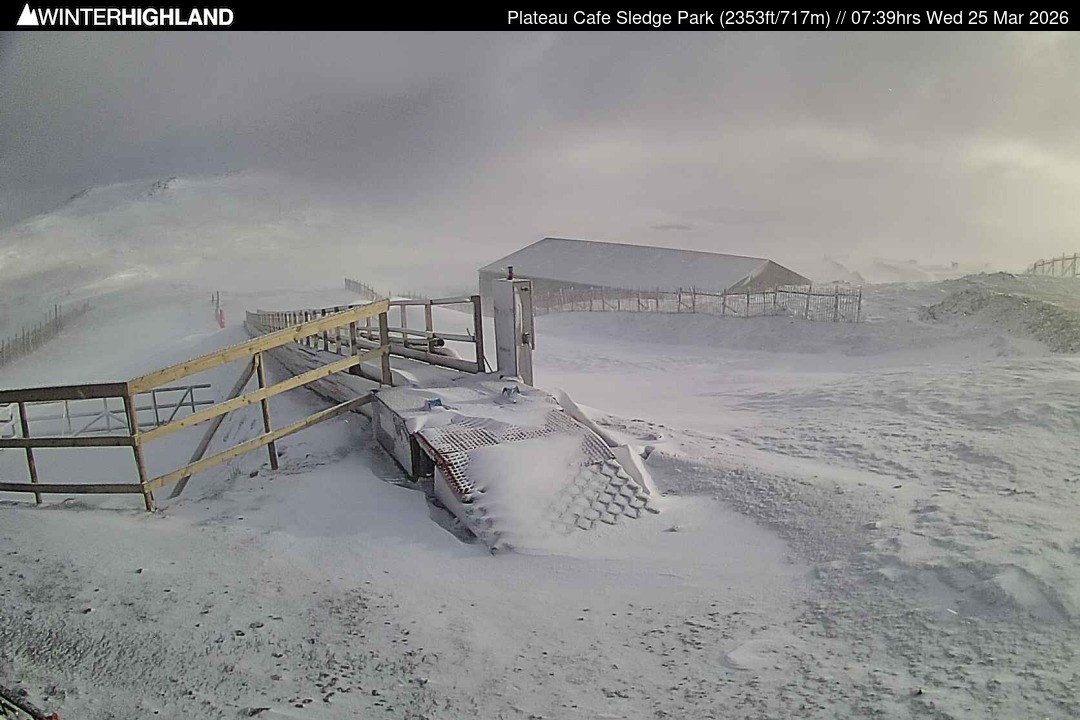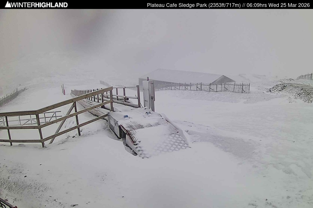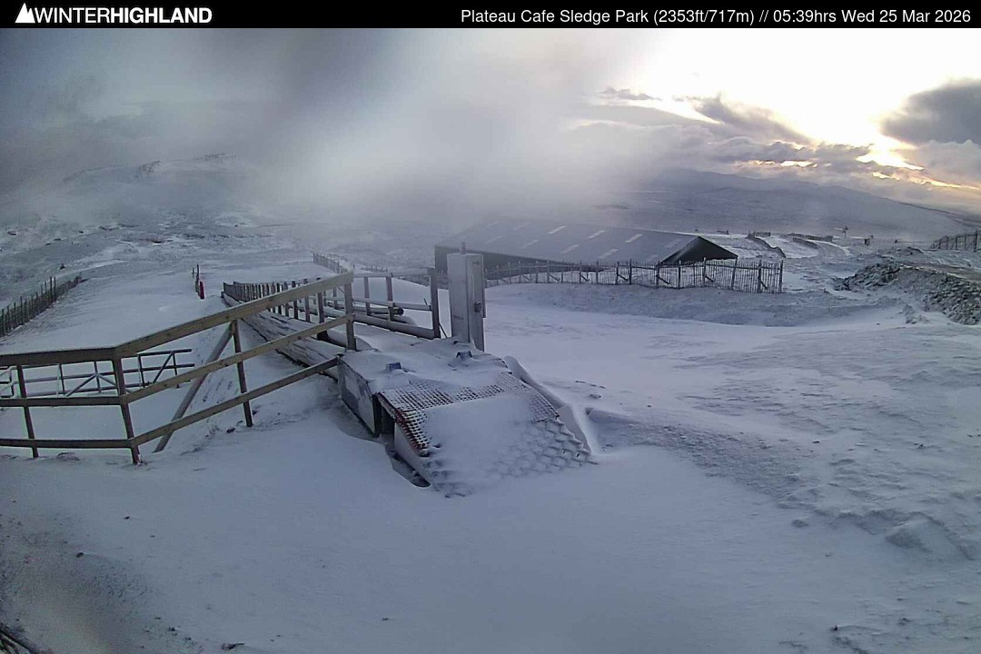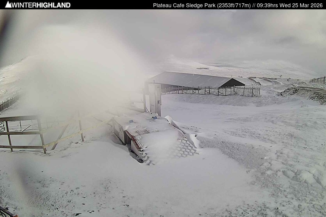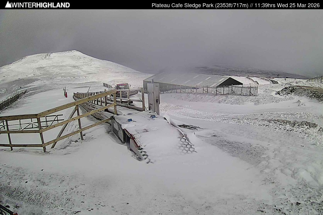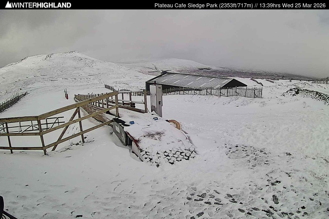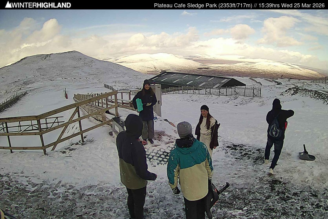 The webcam is located next to the Plateau Cafe in the Glencoe Mountain ski resort in Scotland.