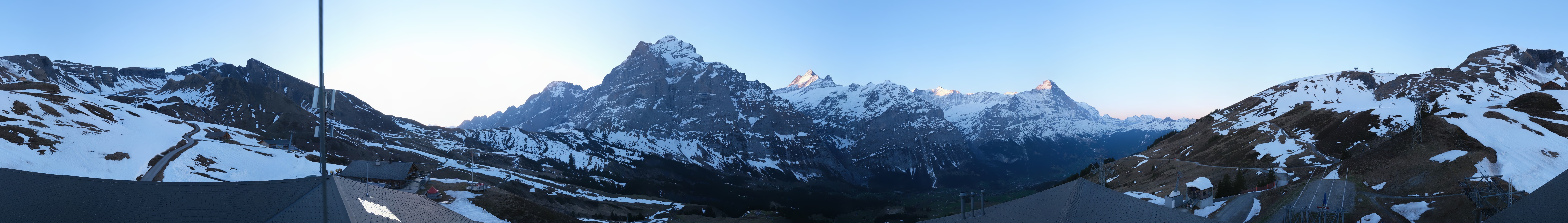 This webcam is located at the midway station of the gondola from Grindelwald to the top of the First. You can see the iconic 4078 meter SAchreckhorn.