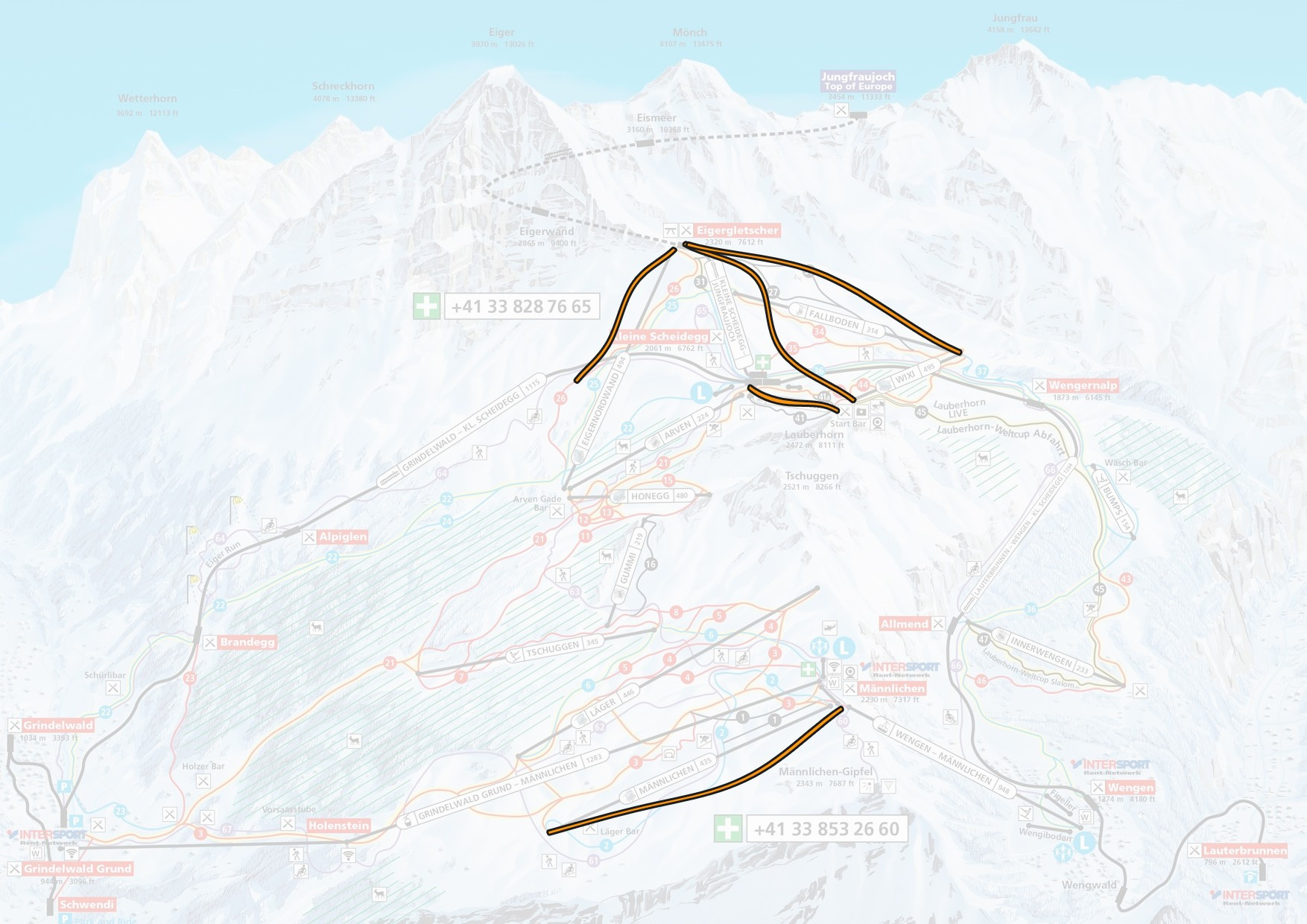 - V3a / V3b: Another route from the mountain station of the Eigernordwand chairlift first requires you to take runs 27 and 32 and then head off-piste at the right spot. We only recommend taking this route if visibility is good! You should cross over back to the run before reaching the valley station of the Fallboden lift.