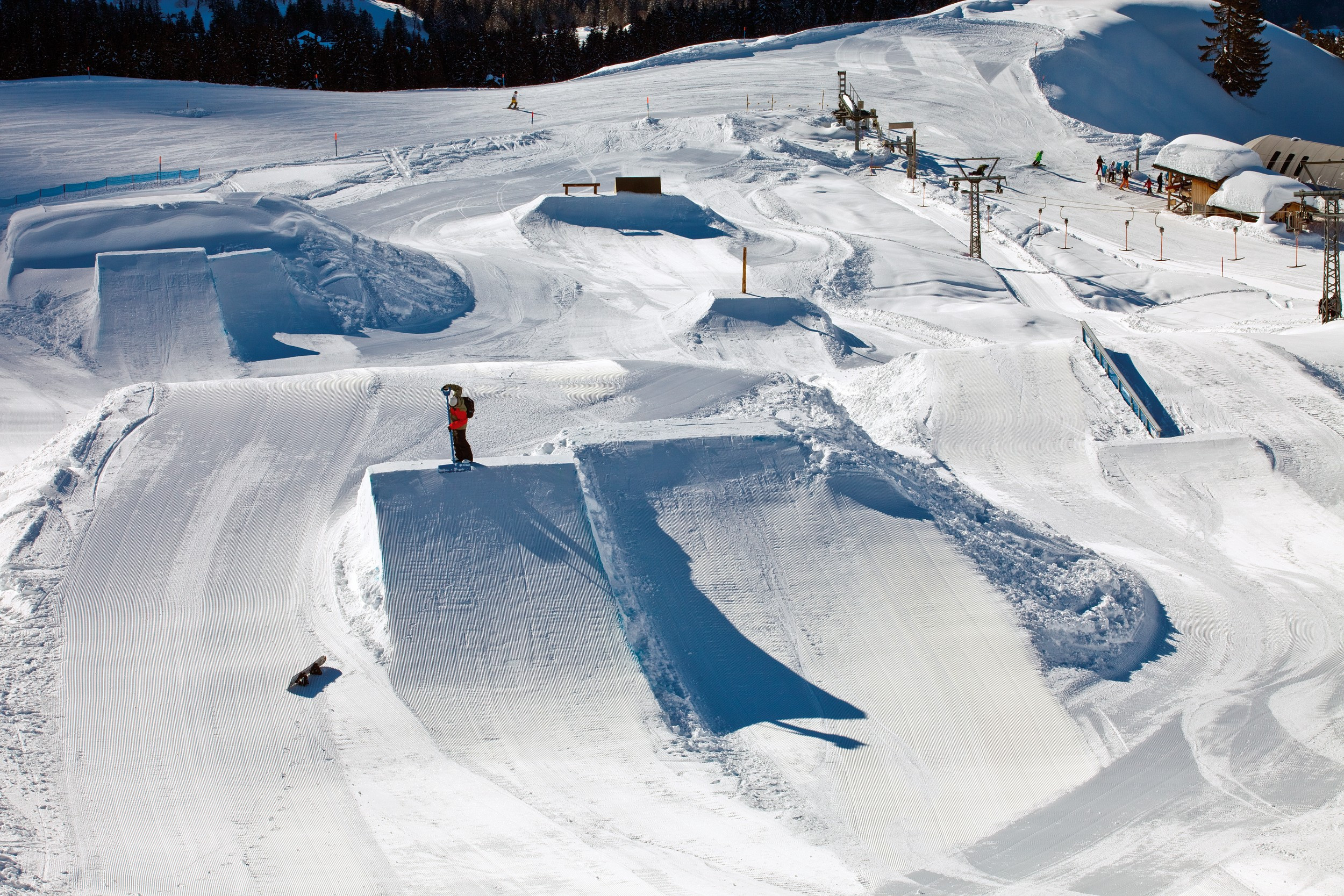 The Beginners Snowpark is located only a few meters below the mountain station of the Oberjoch chairlift at an altitude of almost 2,500 meters. Thanks to this altitude, the park is usually shaped and ready for action early in the season. The Oberjoch chairlift is always ready for carrying freestylers back to the top of the park for another run. The park is largely geared towards freestyle beginners and offers the following obstacles (as of March 2016):