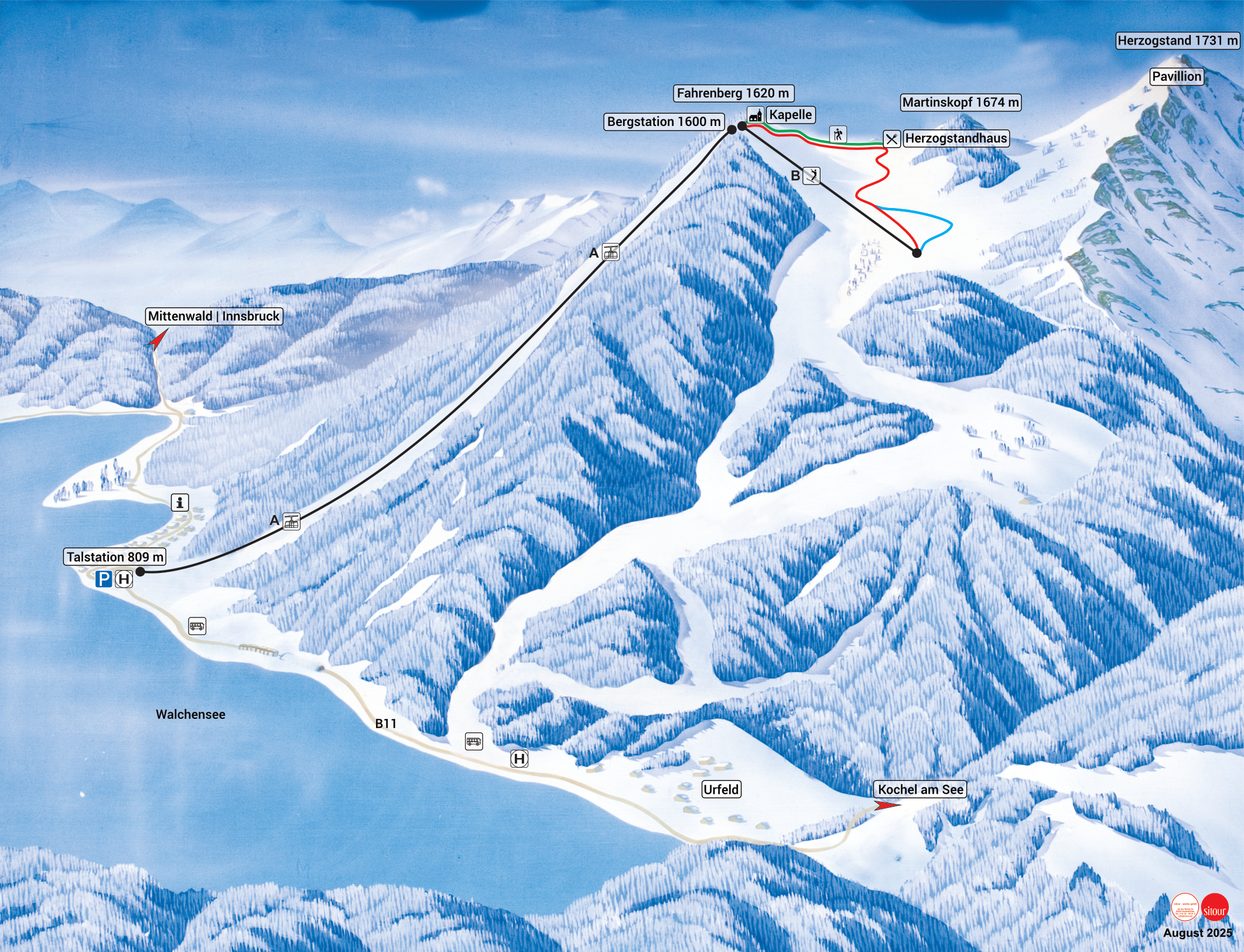 The Herzogstandbahn transports winter sports enthusiasts from the base station in Walchensee to the 1,600-metre-high top station at Fahrenberg. From there it goes over the Fahrenberghang, Haushang and Martinskopfhang slopes to the Fahrenberg lift or further over the Felseneck and Kaltwasserboden slopes back down to the valley. Experienced skiers turn right after the Kaltwasserboden into the steep slopes of the black run. Once in the valley, a shuttle bus brings skiers with a day ticket back from Urfeld to the base station in Walchensee free of charge.