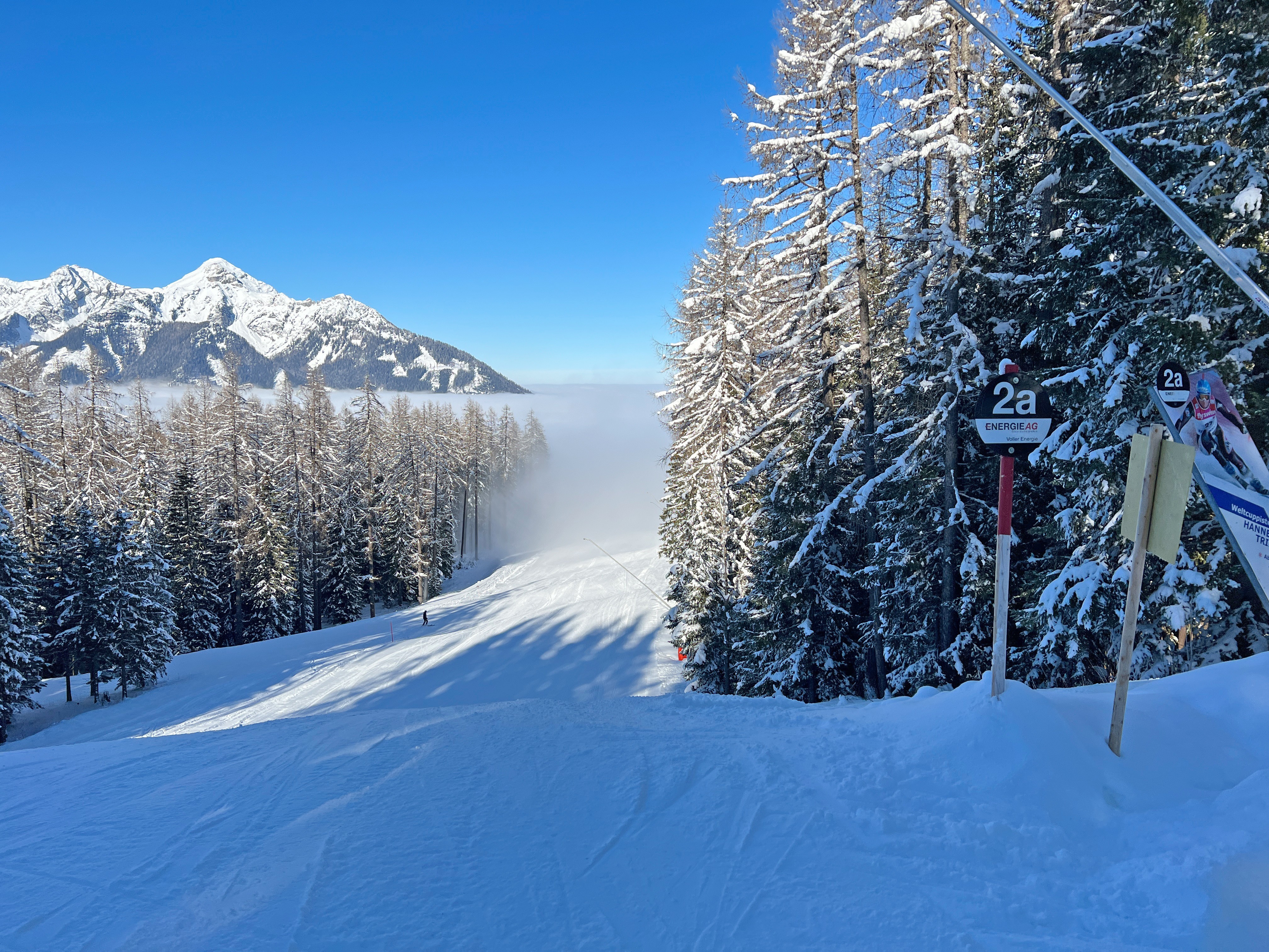The runs to the valley also allow for longer descents once in a while without having to take the lift again right away. But we also liked the shorter slopes like the Lärchenhangabfahrt. However, if you want to get to the highest point in the ski area, you have to take two t-bar lifts. In return, you can start here on the Höss Totale, which leads over 7.4 kilometers back down into the valley.