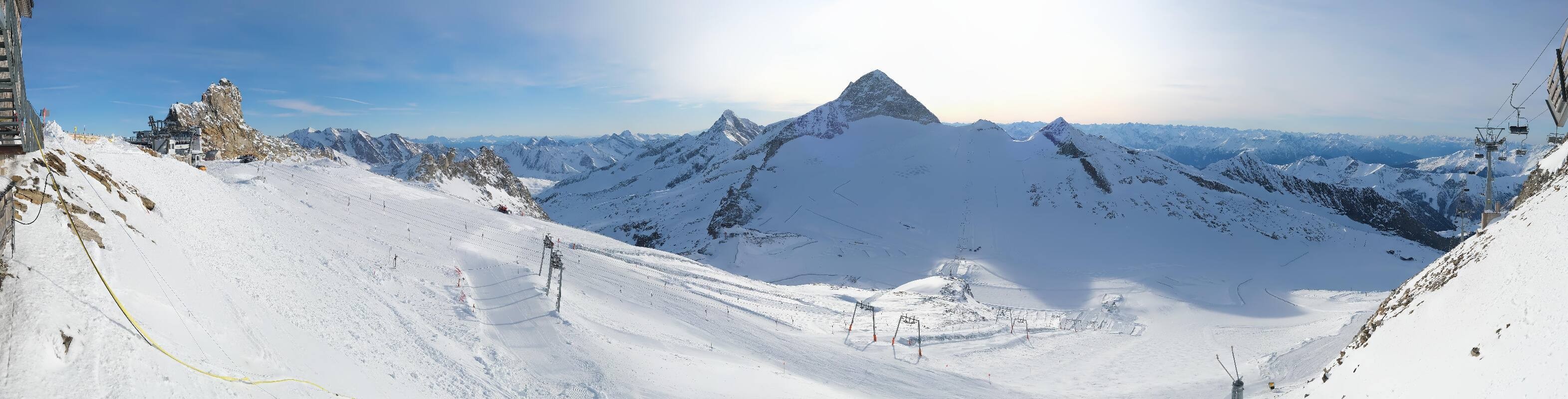 The webcam is located at the mountain station of the Gefrorene Wand chairlift and looks down on the slopes at Hintertux Glacier in the Zillertal. Opposite is the 3,476 meter high Olperer peak.