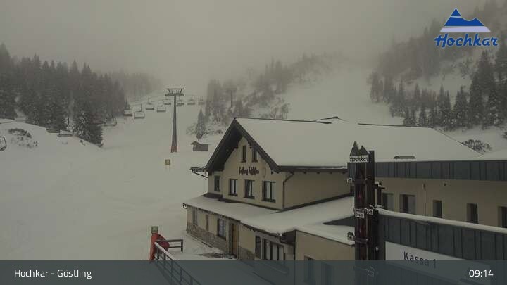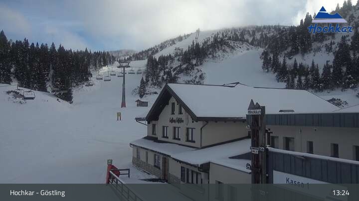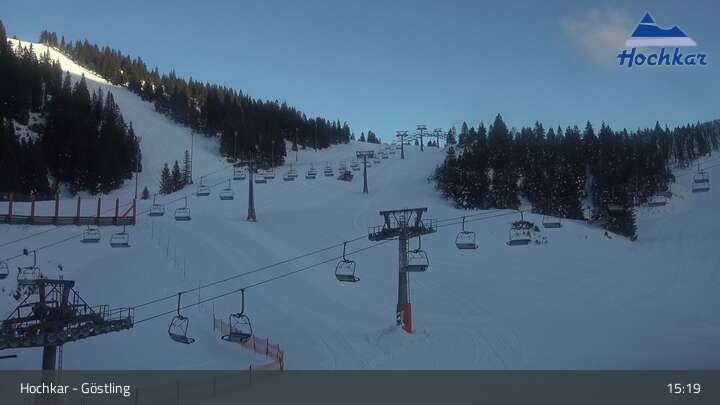 The webcam shows the base station at Hochkar in ski resort Hochkar-Göstling. You can see the chairlifts "Hochkar Vorgipfel" and "Häsing".