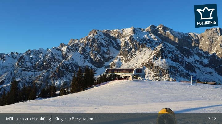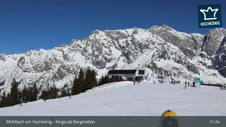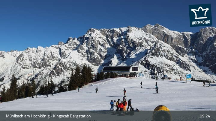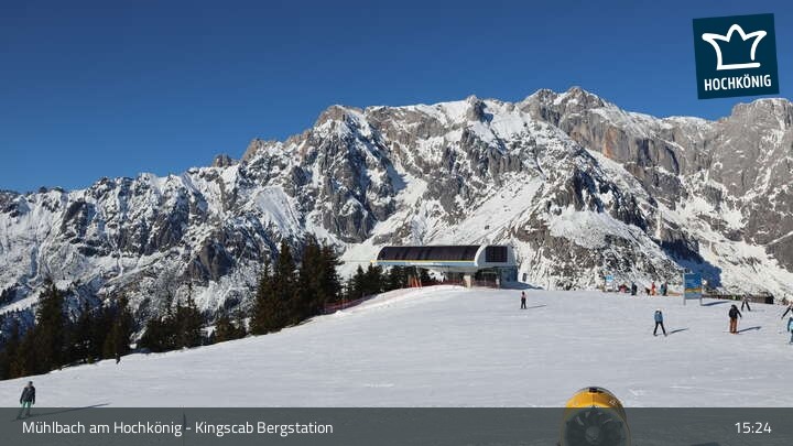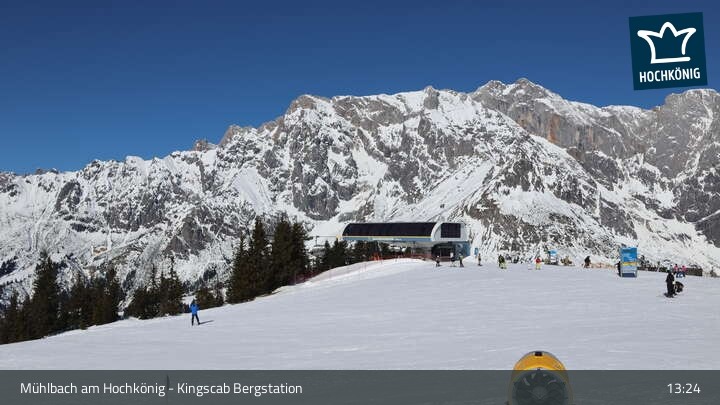 View of Fellersbach ski run and Kingscab top station at the ski resort of Hochkönig.