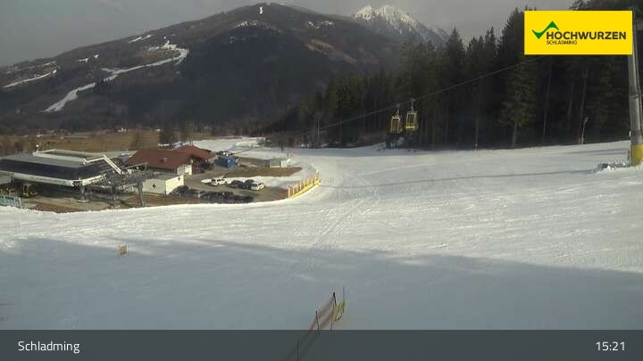 The webcam shows you the gondola Gipfelbahn Hochwurzen as well as the chairlift Rohrmoos II.