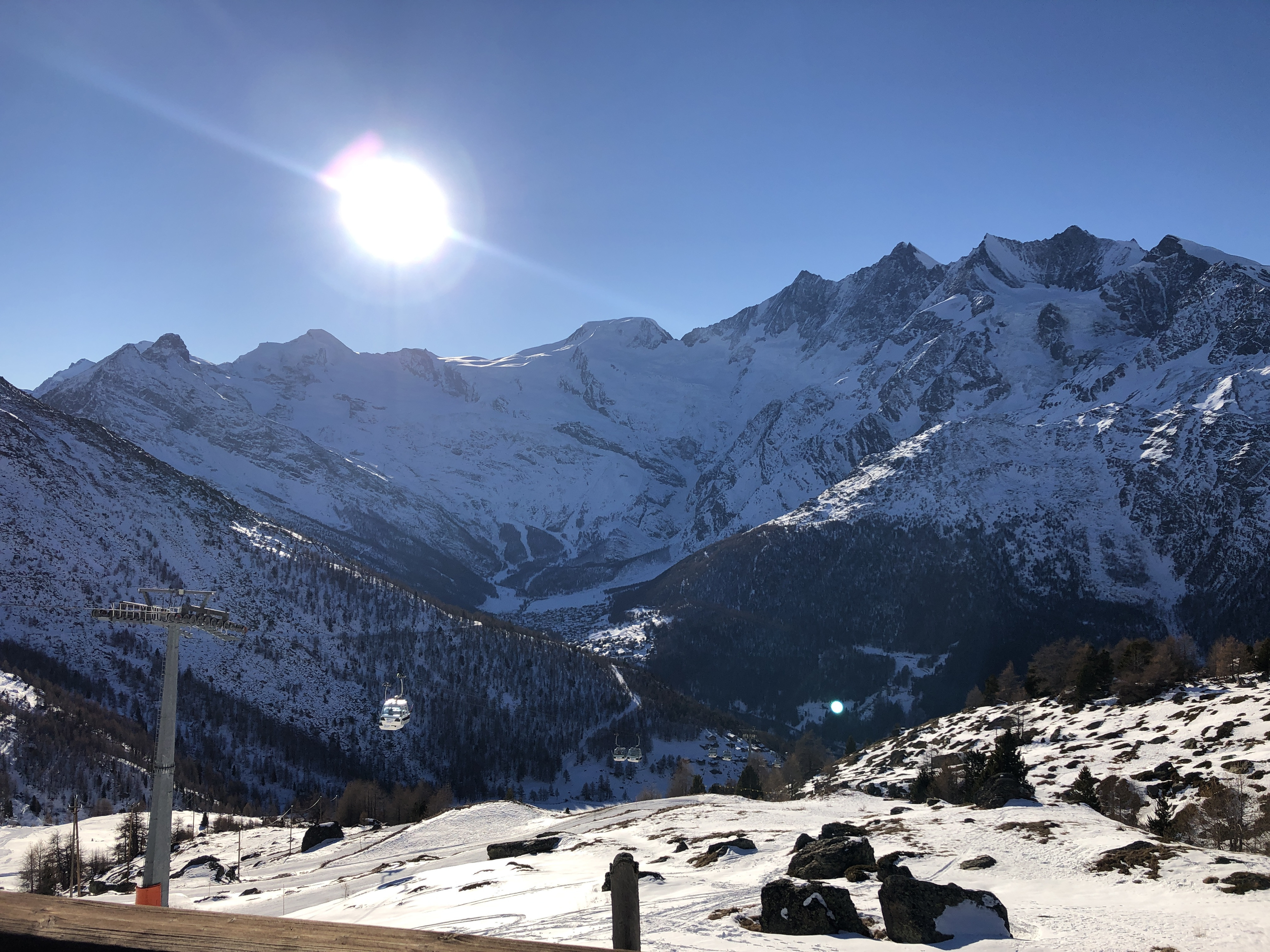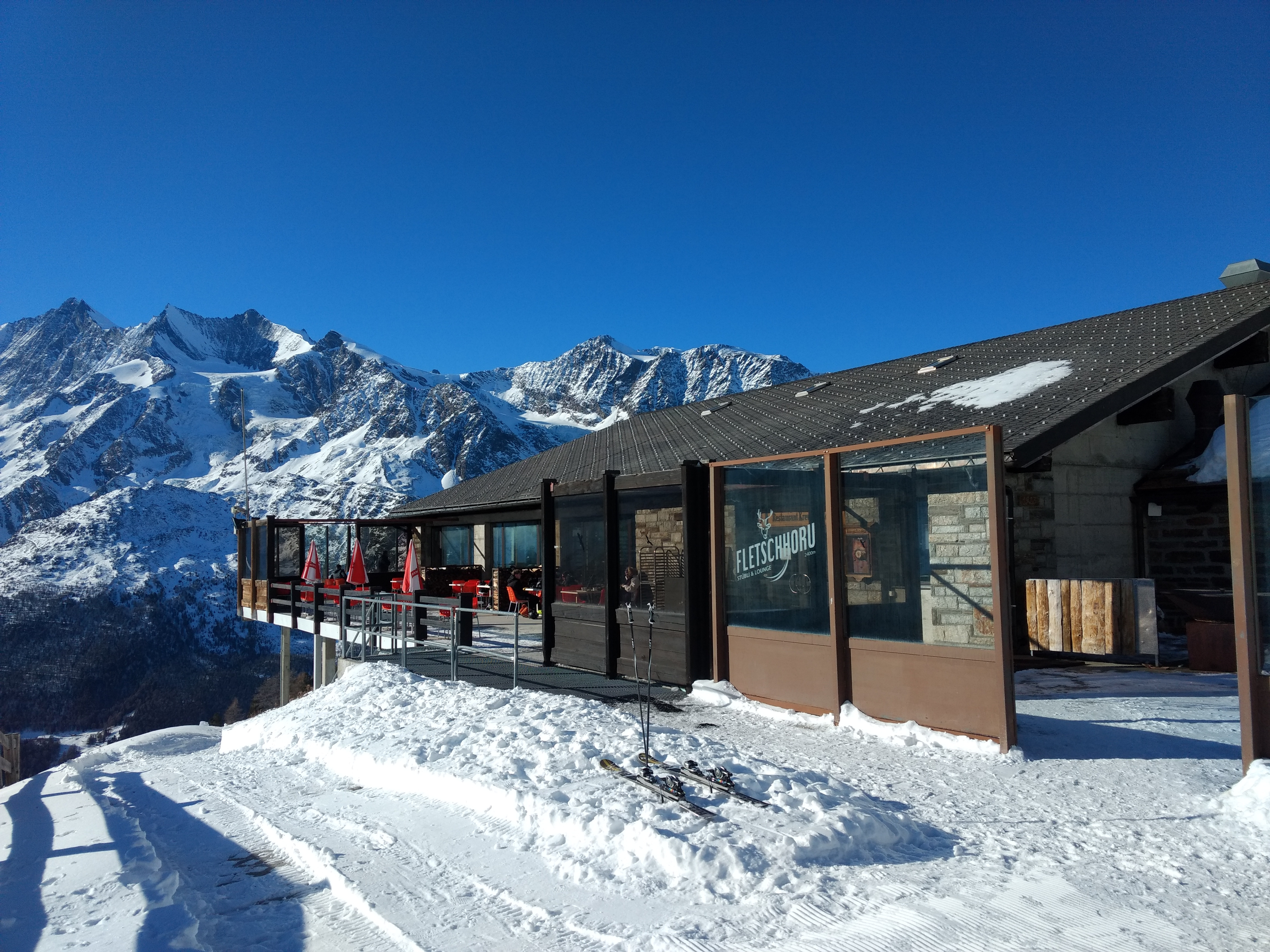 The view is probably only topped by the (somewhat smaller) sun terrace at the Hohsaas mountain restaurant, from which the Monte Rosa massif can be seen.