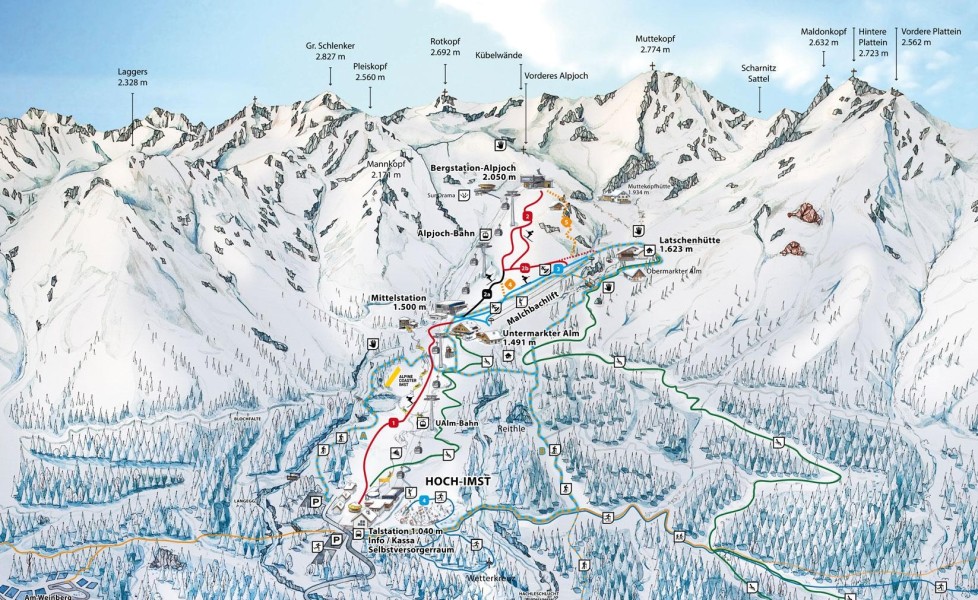 Four lifts take skiers and snowboarders up the mountain in the Imst ski area. Two 10-person gondola lifts lead to the Untermarkter Alm and the Alpjoch. There is also the drag lift at Malchbach and a practice lift in the kids area.