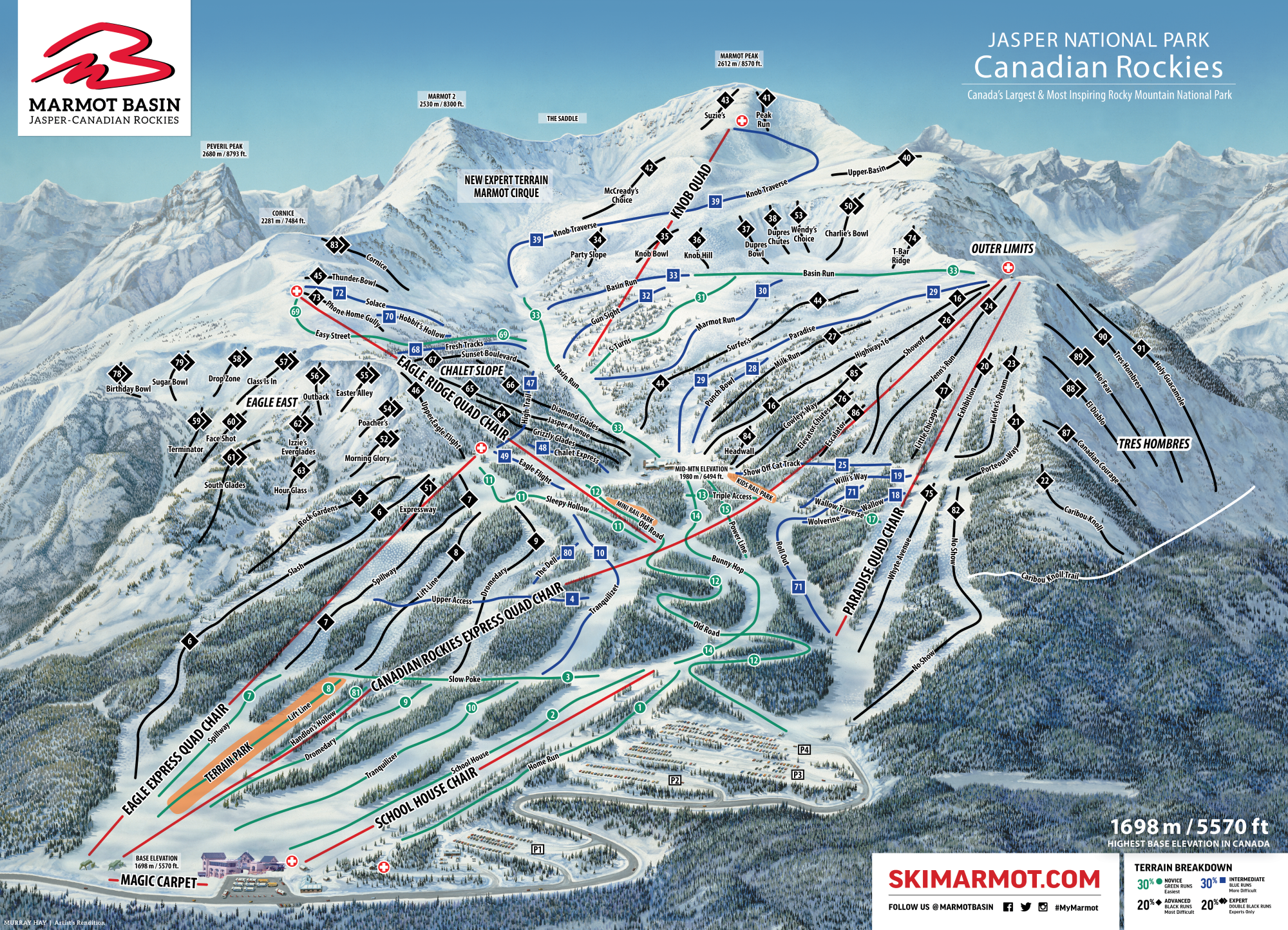 - Offering 696 ha of slopes and terrain, Ski Marmot Basin – Jasper is among the 15 largest Ski Resorts in Canada.