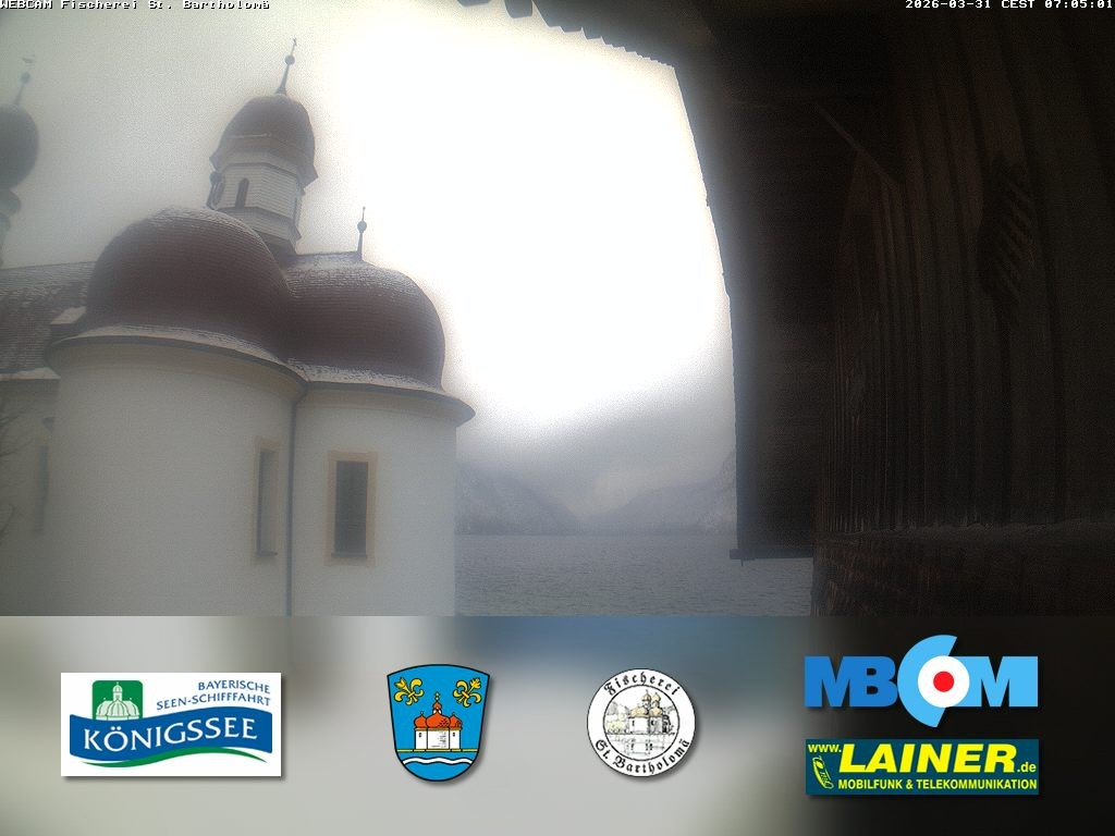 Archived webcam image showing St. Bartholomae and Lake "Koenigssee" on 31 Mar 2026 at 07:01 06:00