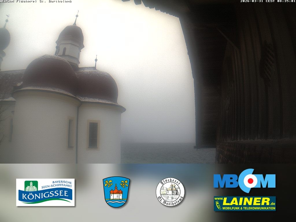 Archived webcam image showing St. Bartholomae and Lake "Koenigssee" on 31 Mar 2026 at 08:01 07:00