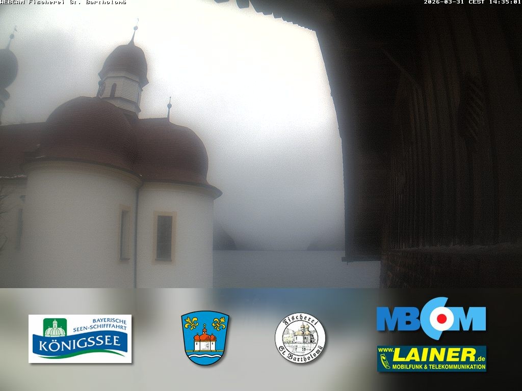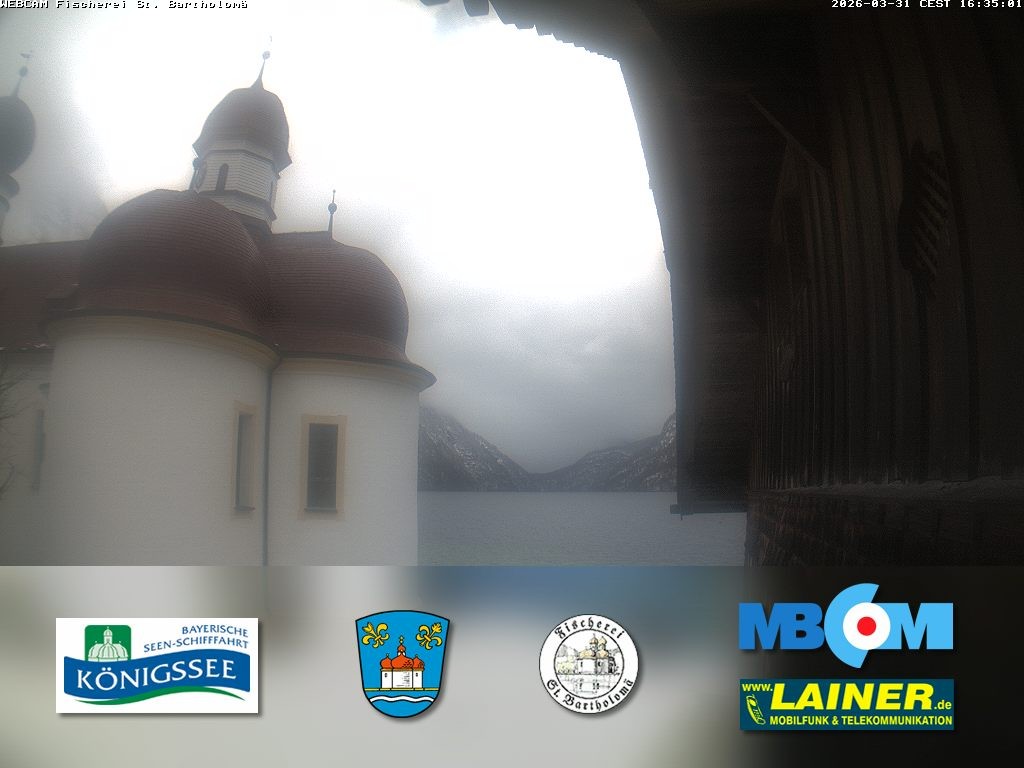 Archived webcam image showing St. Bartholomae and Lake "Koenigssee" on 31 Mar 2026 at 16:01 15:00