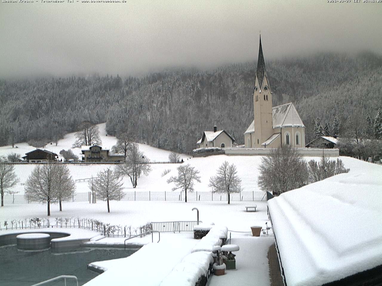 Archived webcam image showing Kreuth - Church St. Leonhard on 27 Mar 2026 at 06:12 05:00