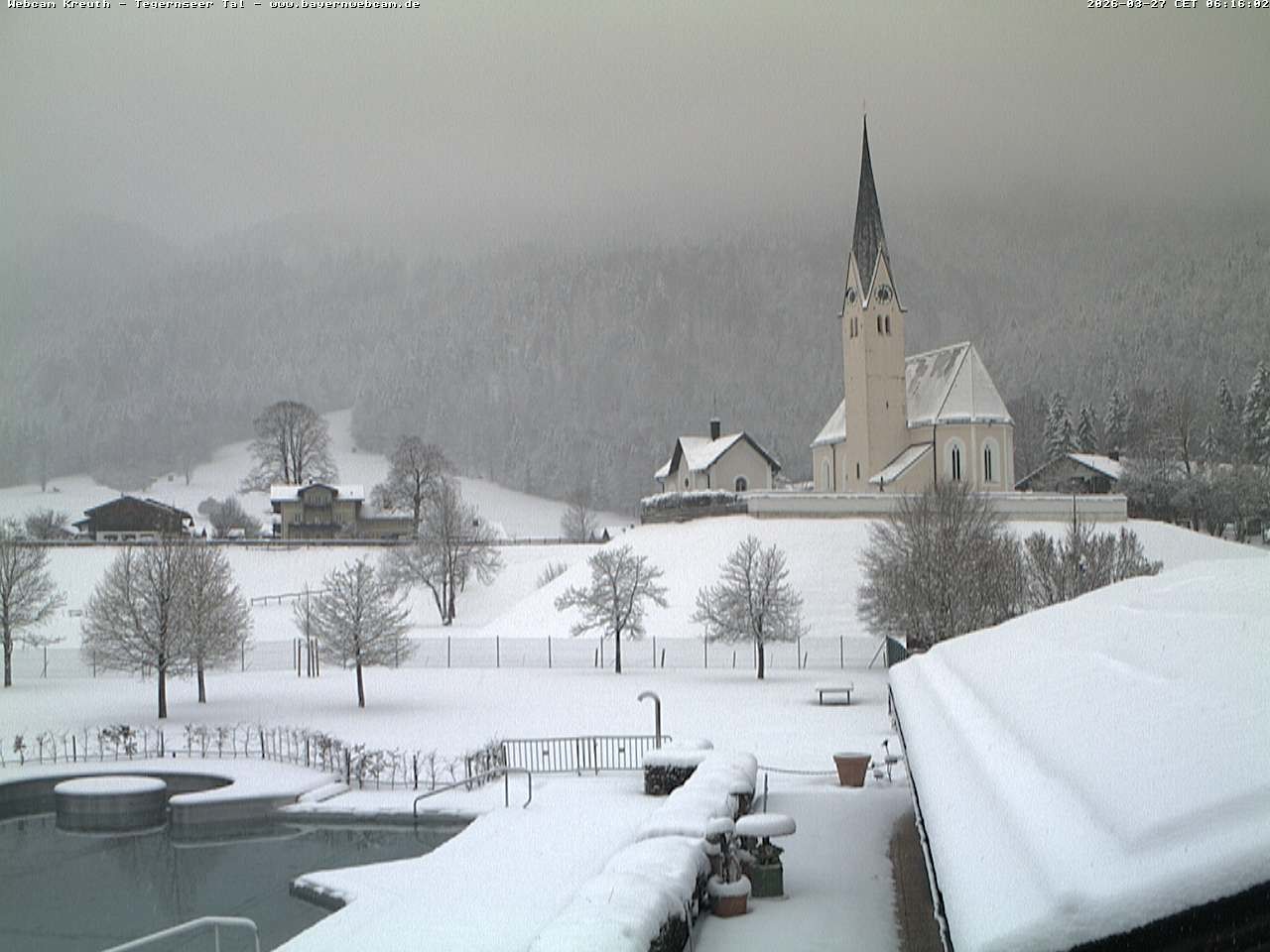 Archived webcam image showing Kreuth - Church St. Leonhard on 27 Mar 2026 at 08:12 07:00