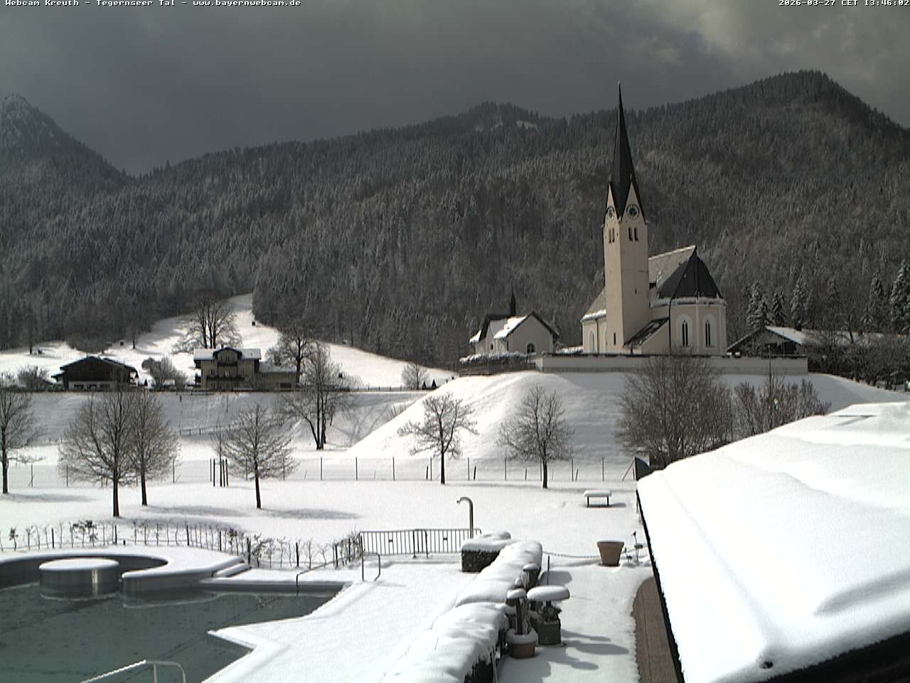 Archived webcam image showing Kreuth - Church St. Leonhard on 27 Mar 2026 at 14:12 13:00