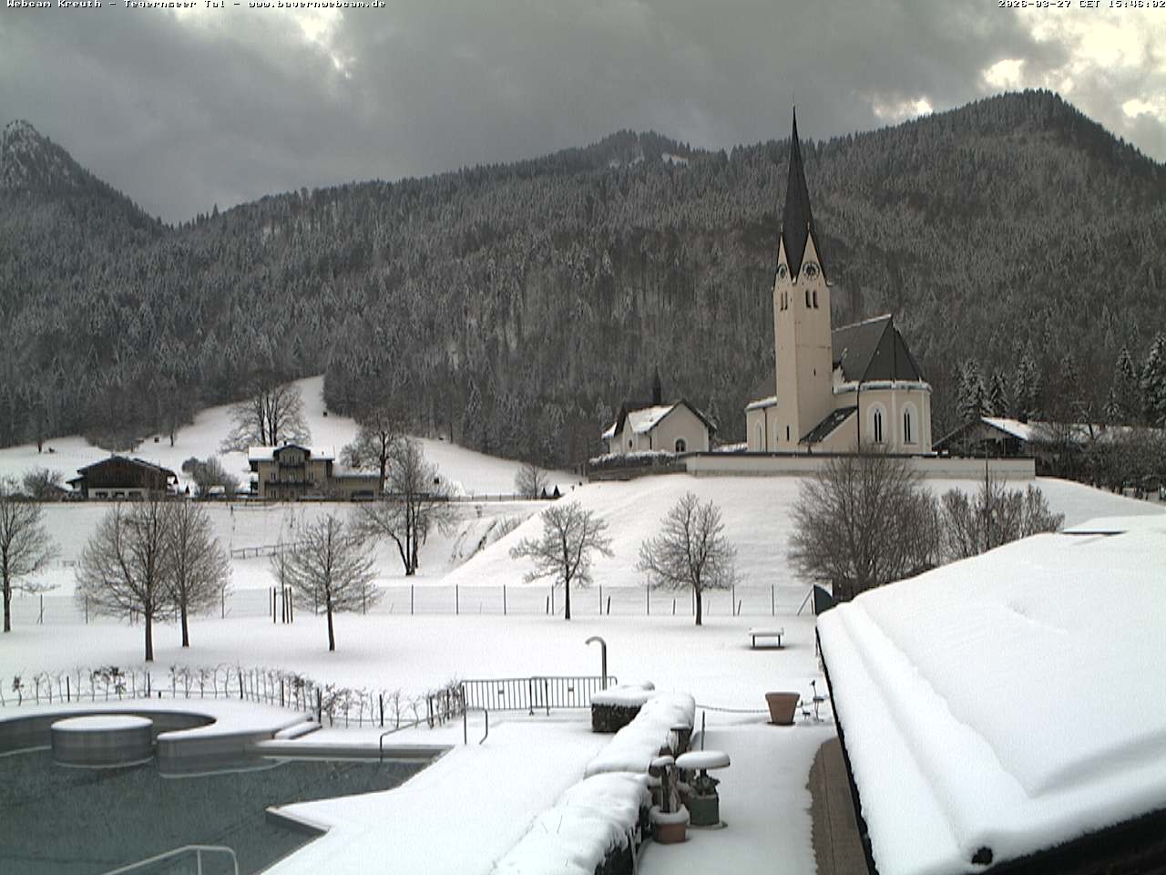 Archived webcam image showing Kreuth - Church St. Leonhard on 27 Mar 2026 at 16:12 15:00