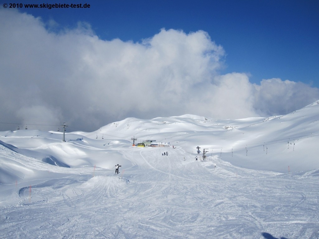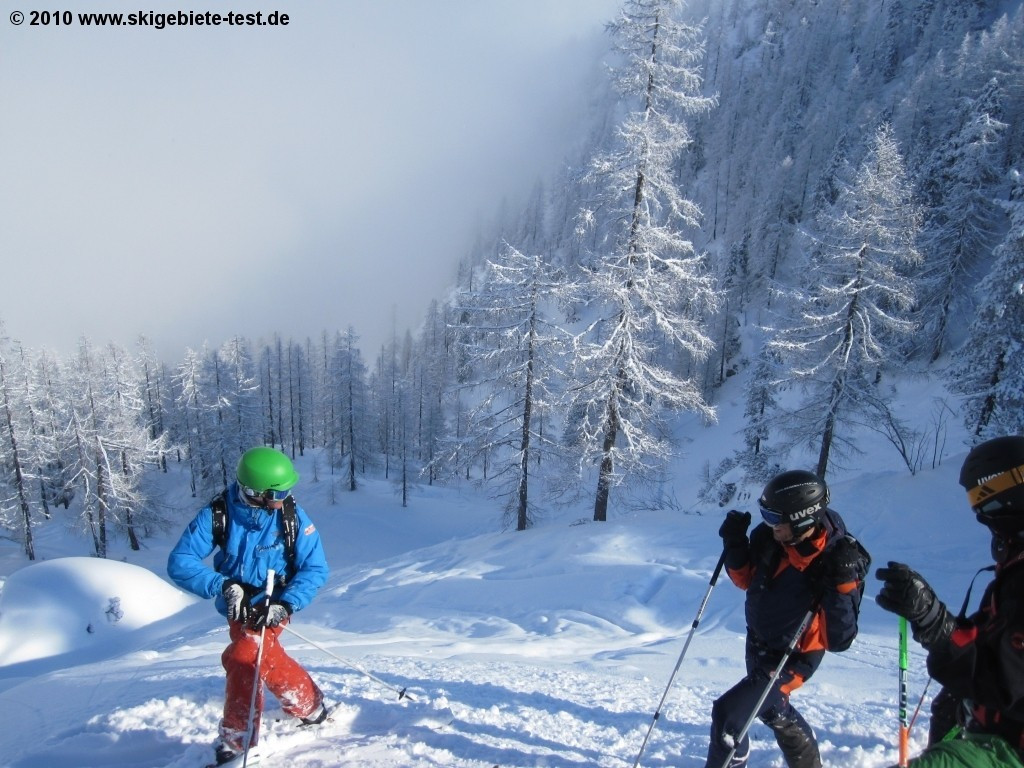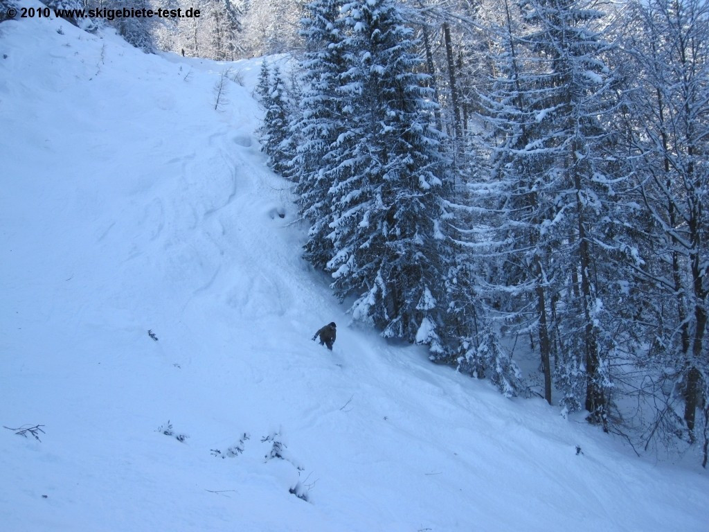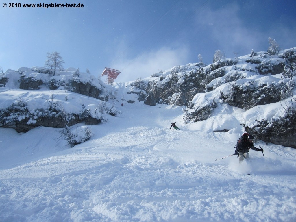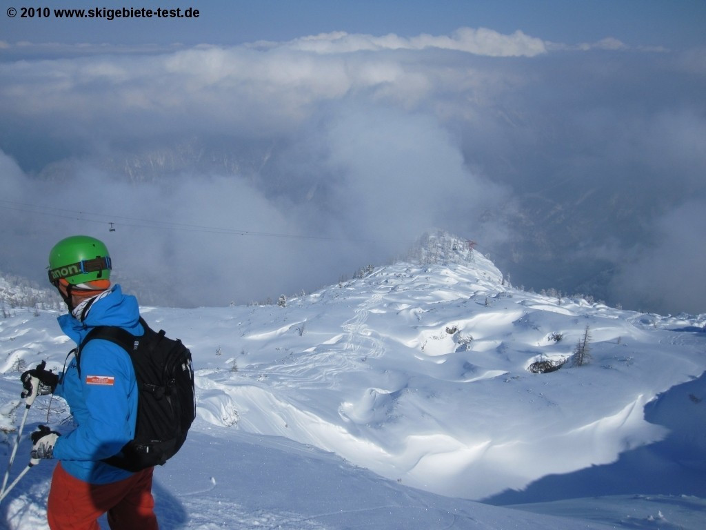 Krippenstein does not really feature a terrain park and the few groomed trails are a joke. Snowboarders head to Krippenstein because it is a back-country paradise. Sheer endless are the powdery descents in Krippenstein. Spine tingling tree runs and long rides down virgin snow – that's what you get in Krippenstein. Before however you head into the “wild“ make sure you obtain essential info on the current avalanche situation and that your avalanche safety gear is complete (helmet, probe, tracker, shovel). It is definitely recommendable to hire a guide (under outdoor-leadership.com) as the area can be mined with doles and crevices hidden under a thick blanket of snow. Further advantage the guides take you to the real hotspots of the region! If you however need some air-time to call it a perfect day out on the slopes there are a couple of medium-sized jumps and rails right by the mountainstation (for more info see: www.krippenstein.com/winter/ski-board/funpark/ Novice riders have a small beginner area (featuring tow-lifts) at their disposal at the base and two easy trails up on the mountain.