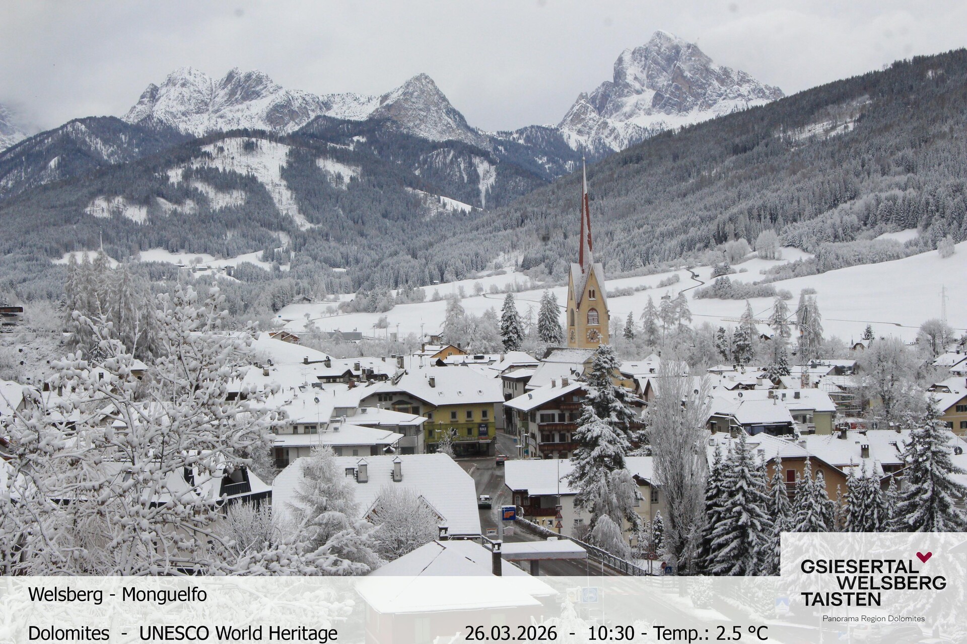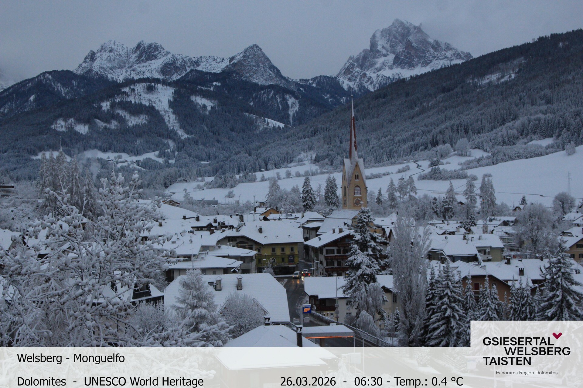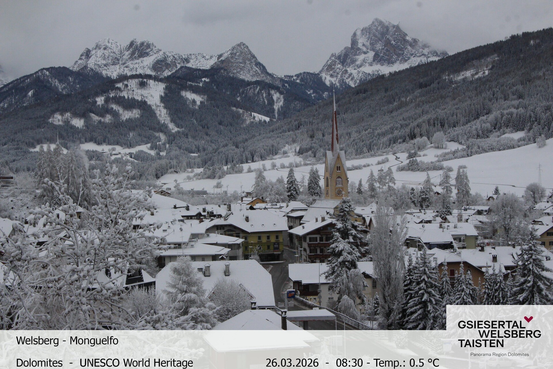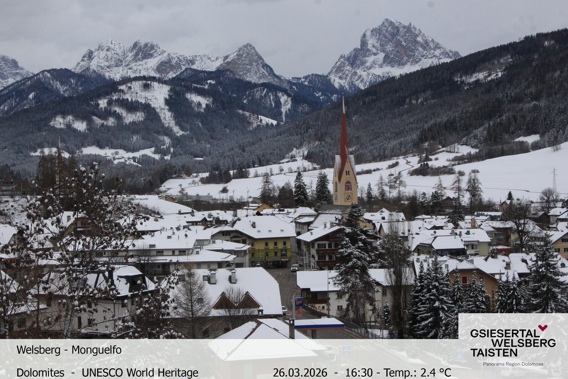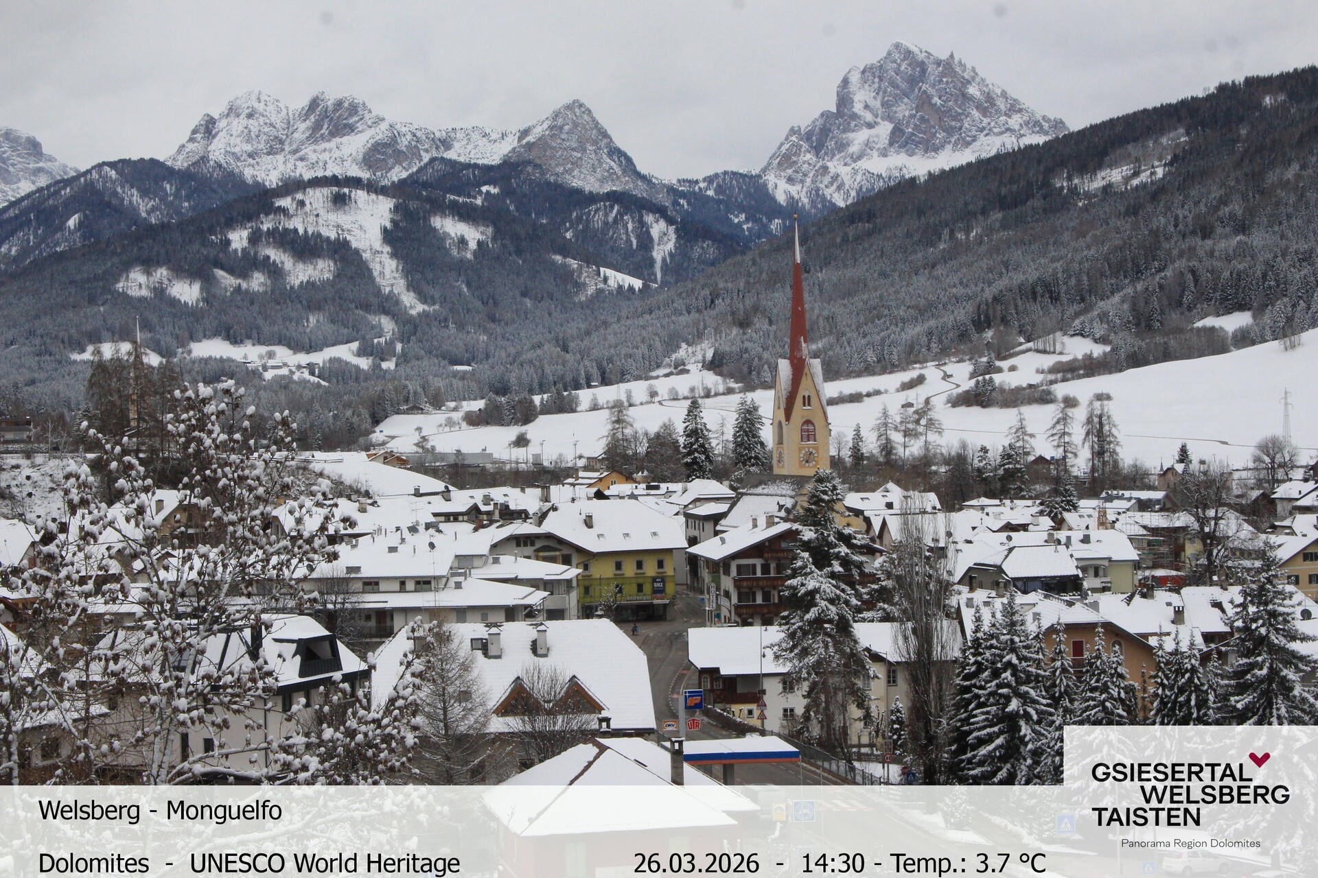 The webcam provides the look towards village Welsberg in South Tyrol, Italy. It is located at the foot of the Dolomites and is a popular holiday destination.