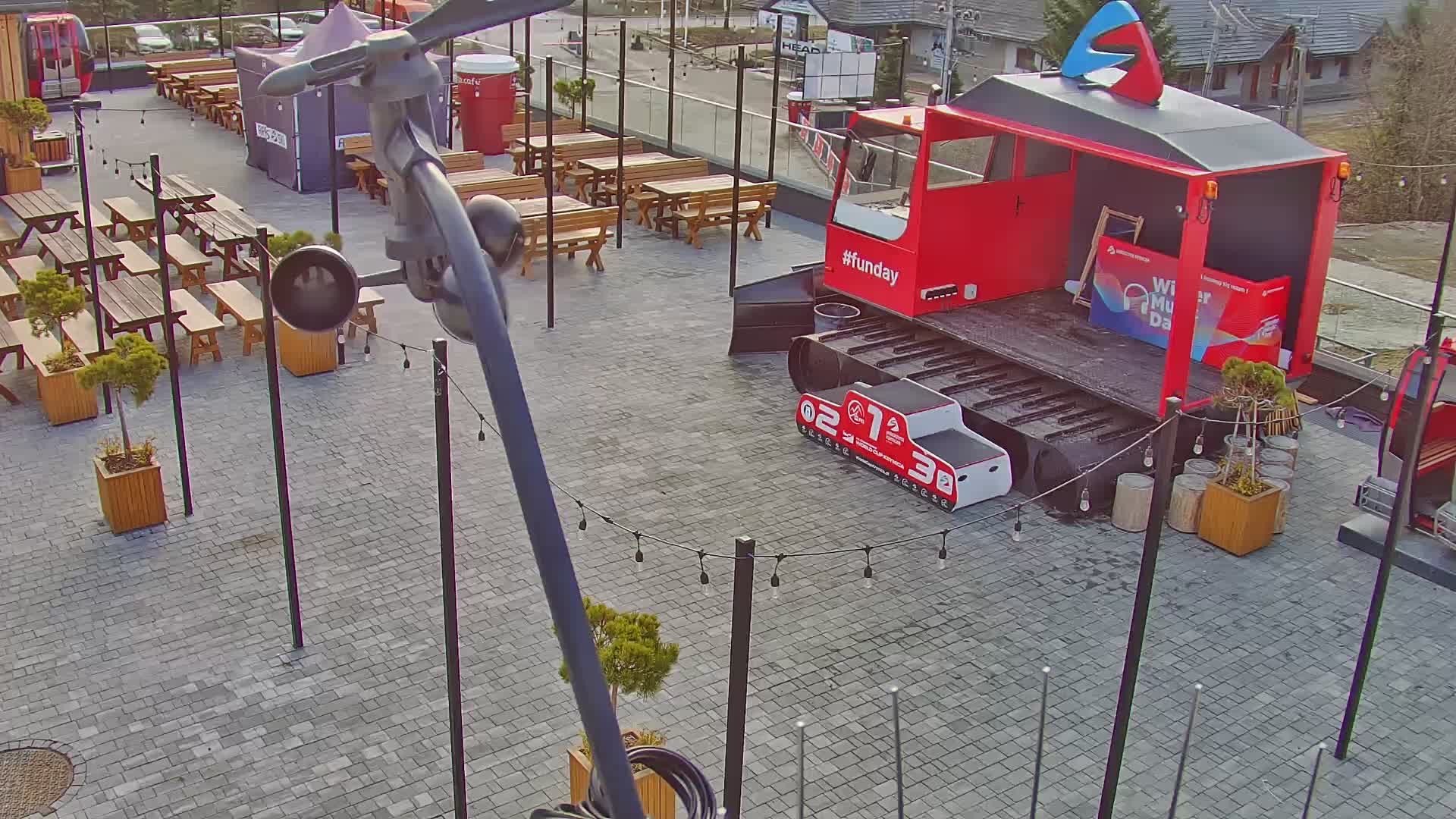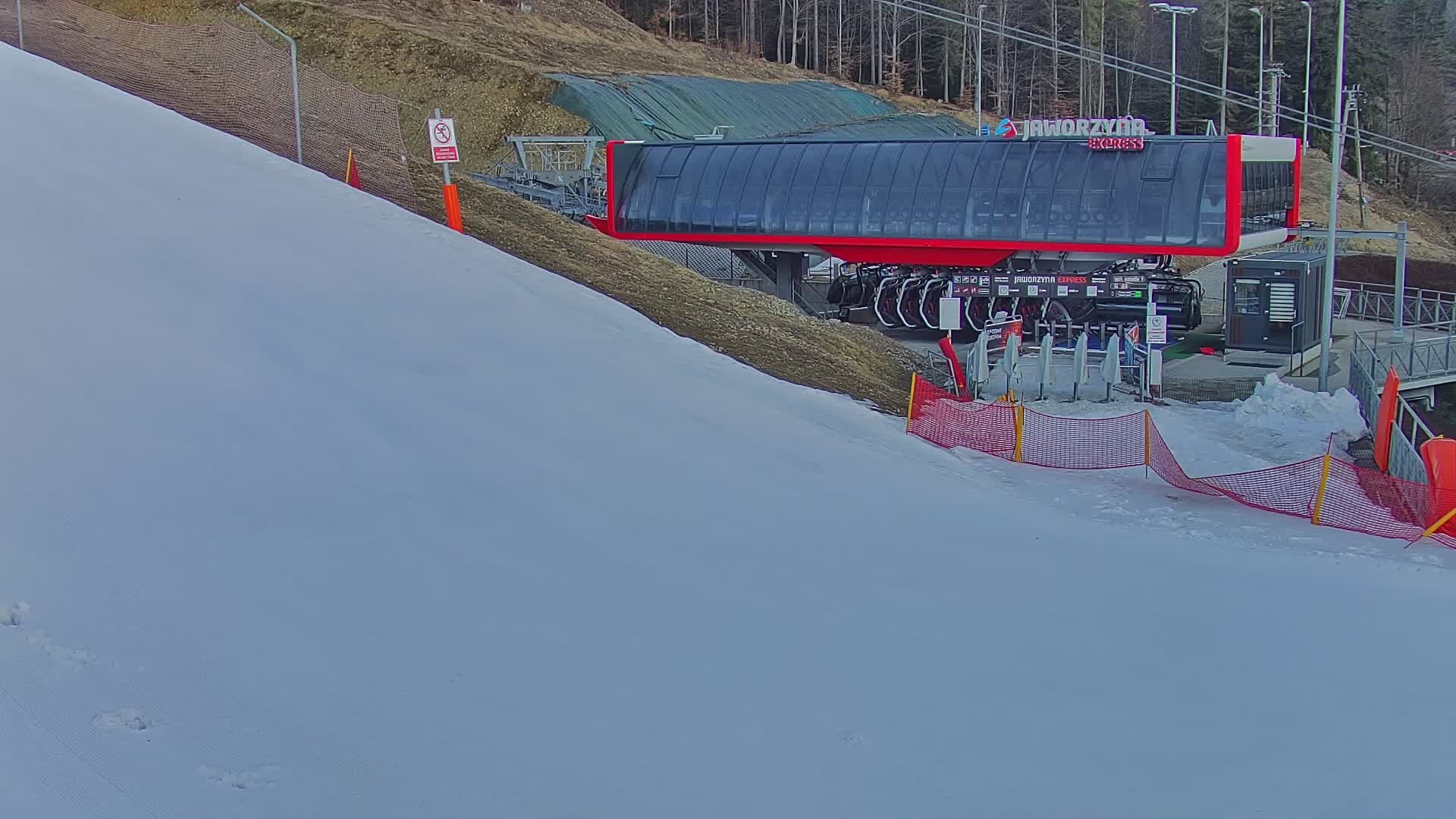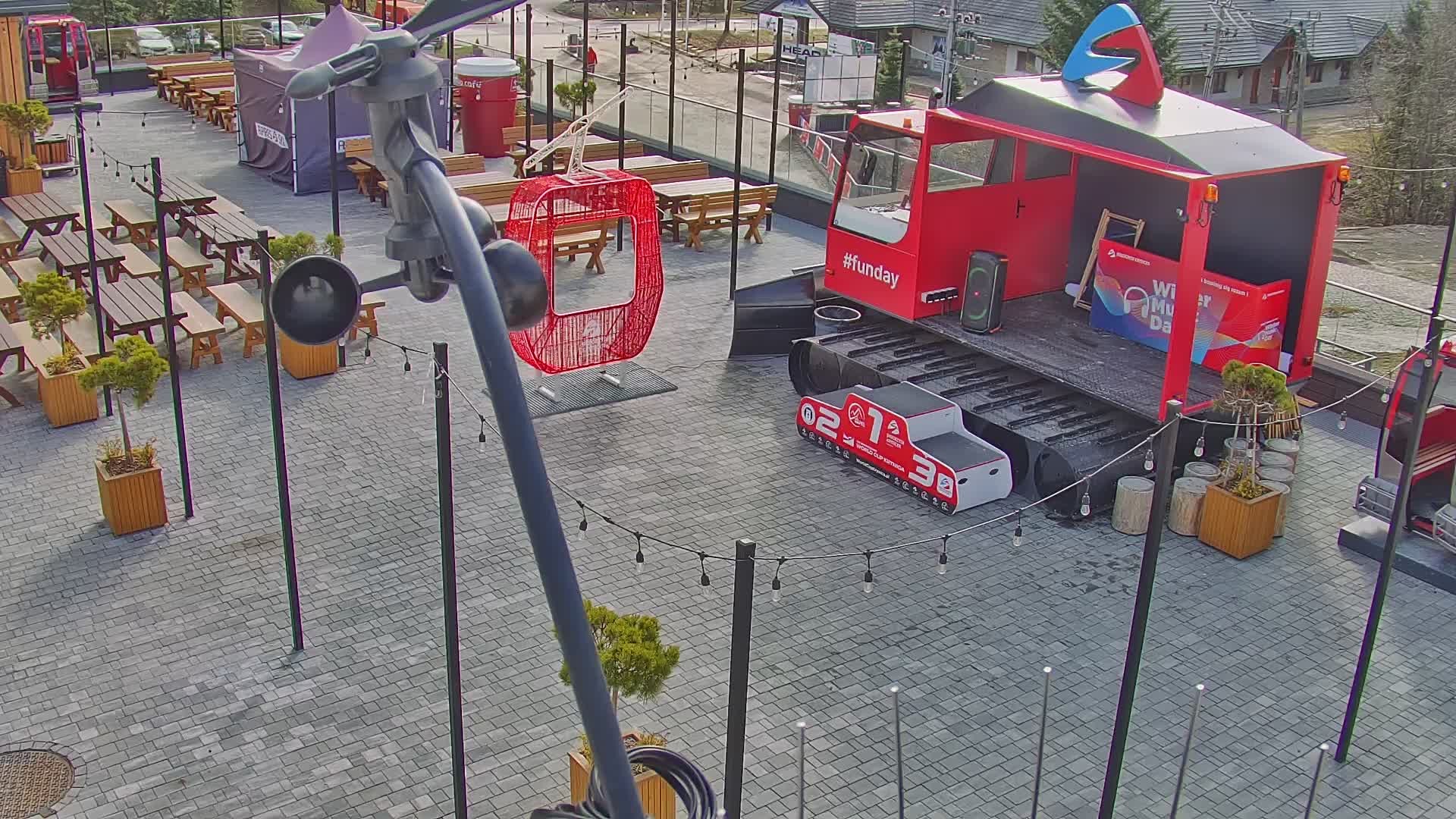 The webcam is located next to the base station of the cable car in the Polish ski resort Jaworzyna Krynicka.