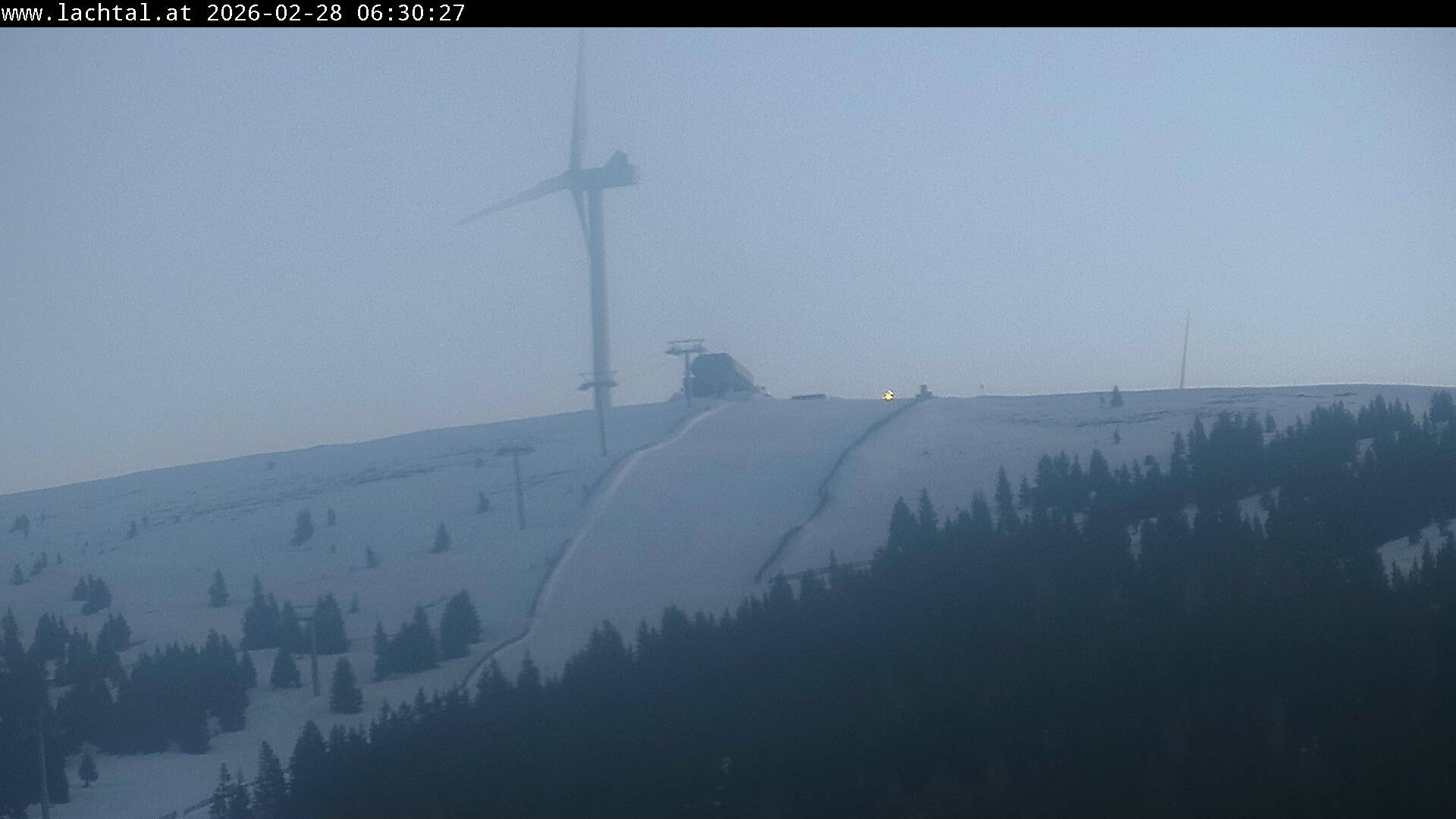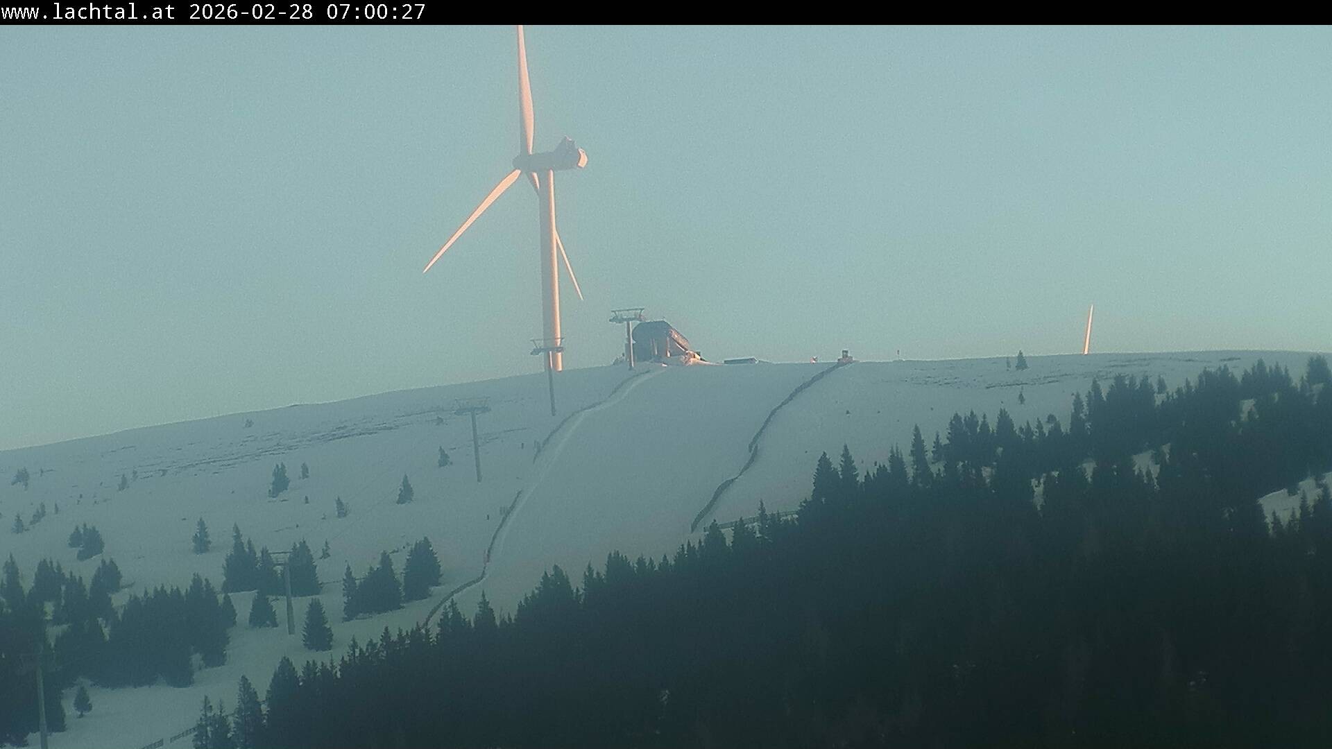 The webcam shows the top station of the chair lift Schönberg Schaukel in the ski area Lachtal and the moderate slope Almrausch.