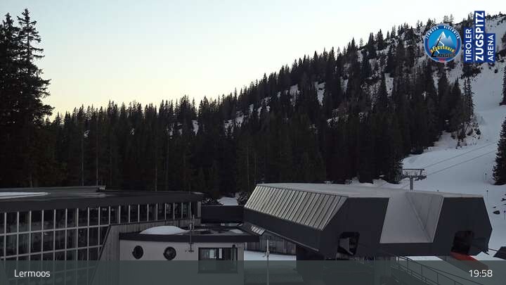 View from the mountain restaurant Grubig alm into the ski resort of Lermoos Grubigstein.