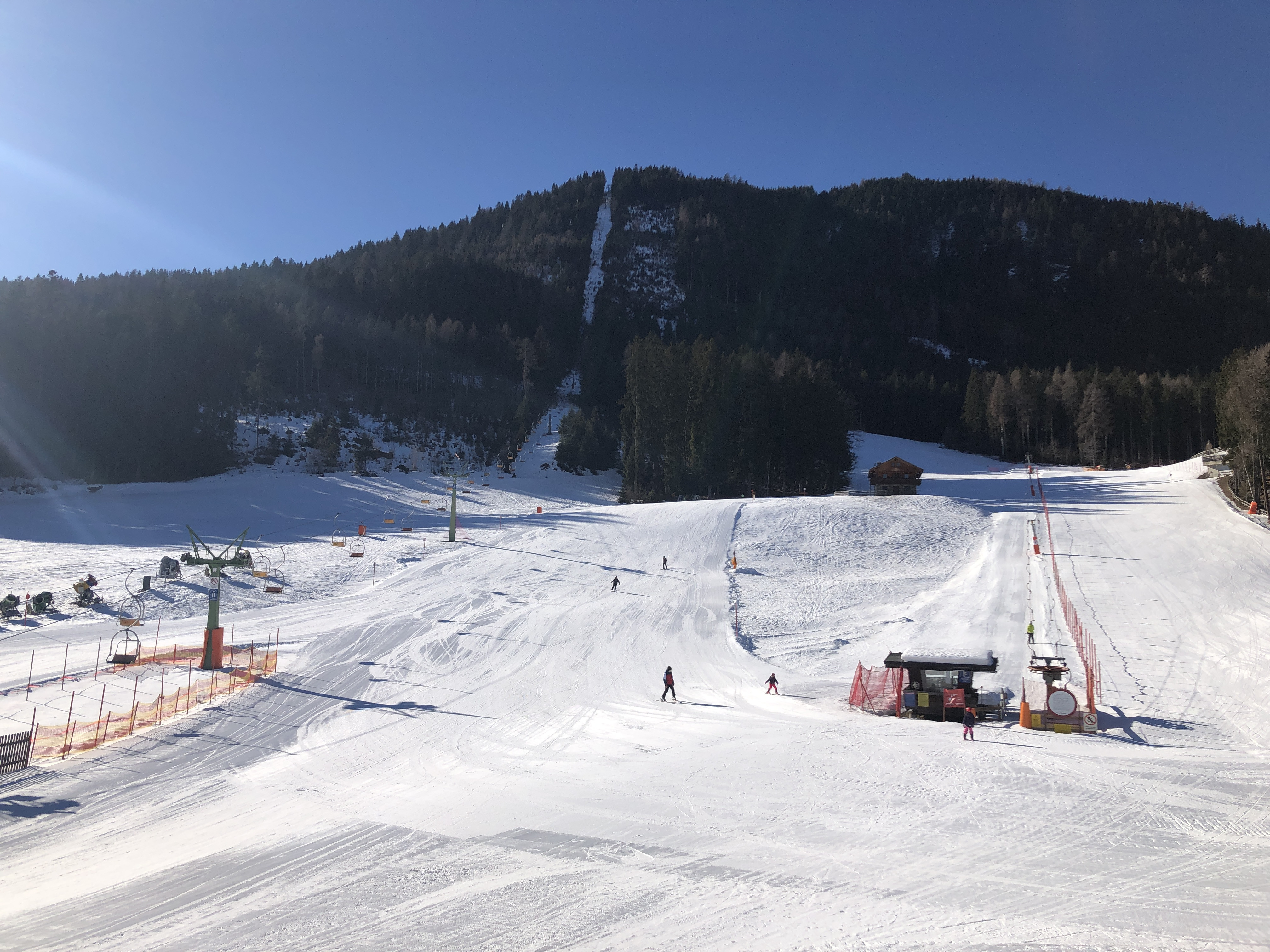 The best mountain for beginners in Lienz is the Zettersfeld area. Although you first have to climb almost 1,000 meters in altitude to reach the extensive snow basin, you then have a really wide range of snow-sure slopes between 1,660 and around 2,250 meters in front of you. Once at the top, you should first orient yourself to the right. Around the Wartschenbrunn 4-seater chairlift, in addition to easy downhill runs, there is also the small Kinderland and a Fun Area. The 6-seater chairlift Faschingsalm starts only a short distance away. The slopes are mostly marked blue or red and can be mastered by everyone. Especially the wide ski slopes number 1 and 8 are perfect for practicing and cruising. The slopes around the Steinermandl are mostly classified as red according to the trail map. However, the slopes are very wide, which means that even weaker skiers can manage.