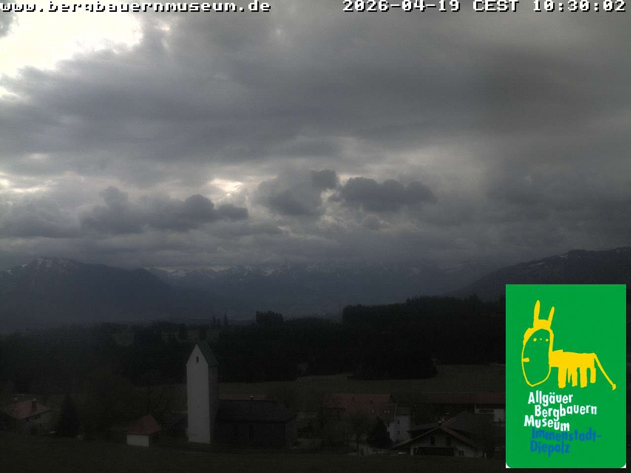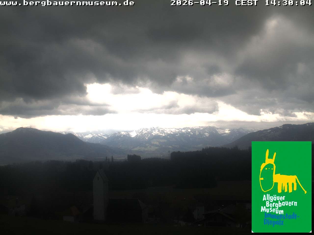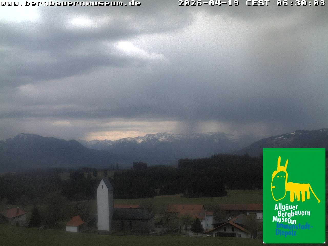 The webcam offers the view from alpine hut “Höfleaple“ that is located in the Museum of Mountain Farming in Diepolz (Allgäu). It shows the village Diepolz and the Allgäu Alps. The Höflealpe hosts an exhibition about the ancient work in the forest and provides information about poachers.