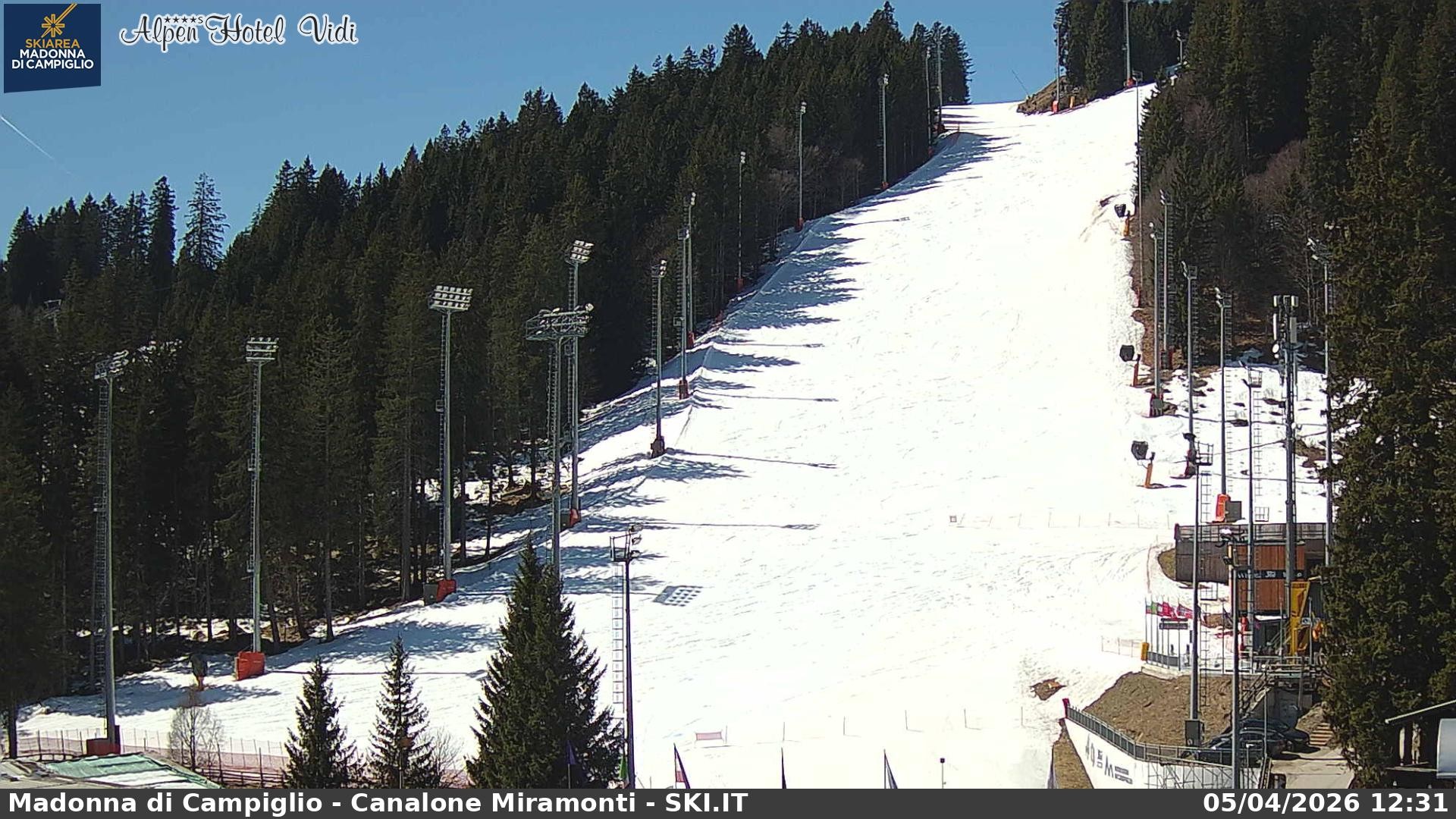 The webcam shows the Ski World Cup Run Canalone Miramonte in Madonna di Campiglio.