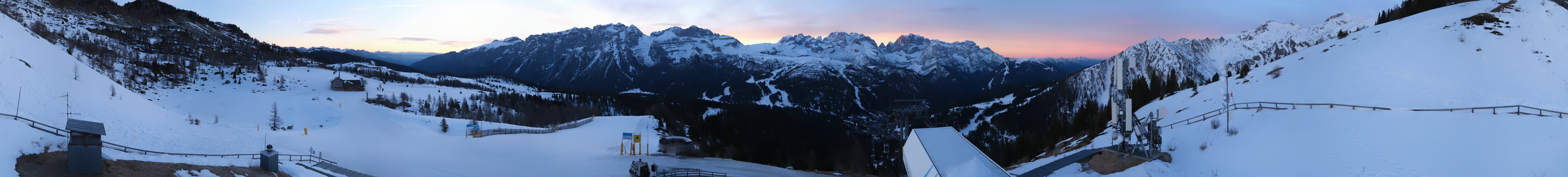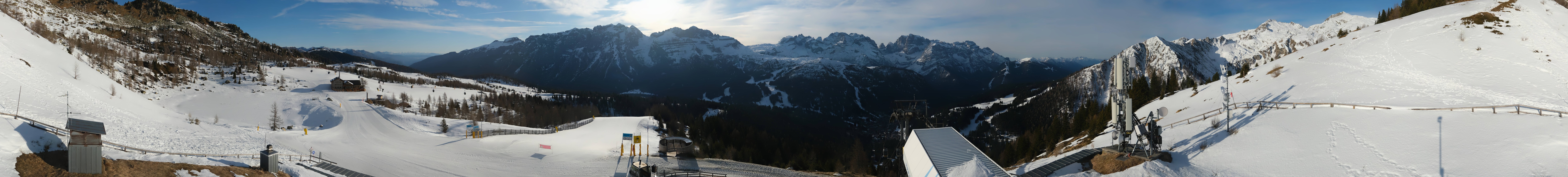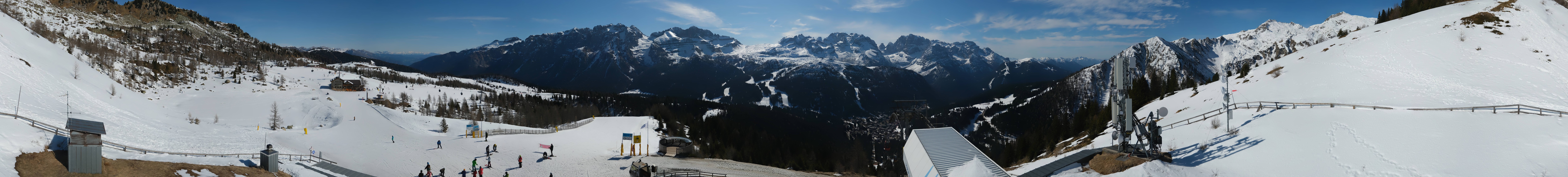 Amazing view from the top station of the gondola Pradalago Express in Madonna di Campiglio. It is the starting point of the easy slope Pradalago Facile and the advanced run Amazzonia. In the background you can see the chair lifts Fortini Express and Zeledria Express and the Rifugio Viviani.