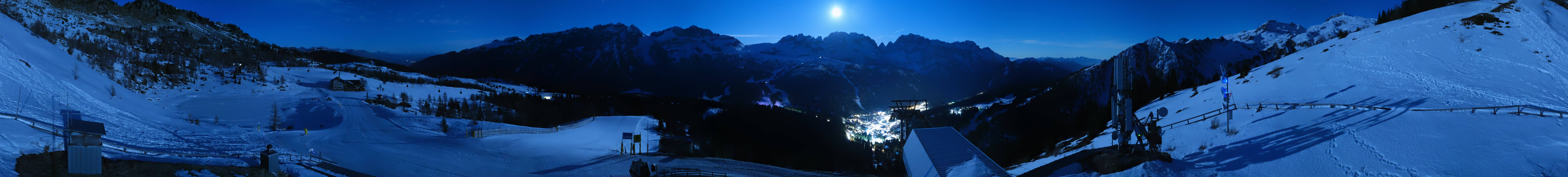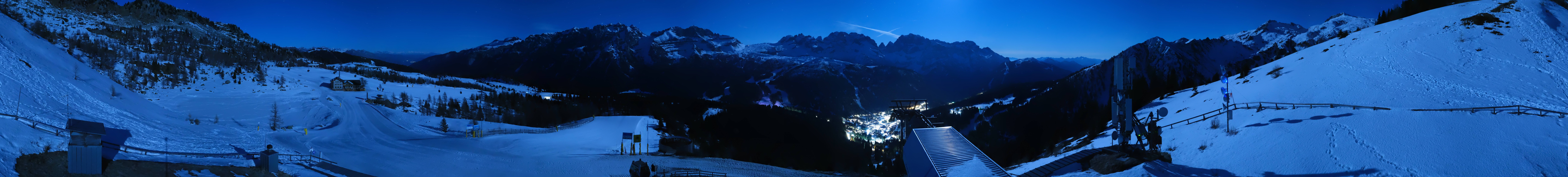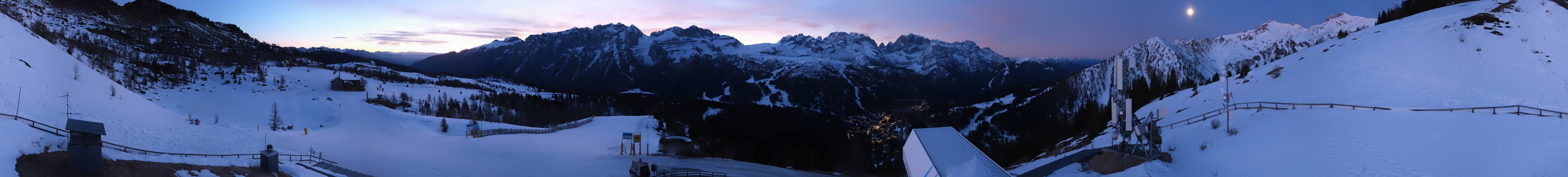 Amazing view from the top station of the gondola Pradalago Express in Madonna di Campiglio. It is the starting point of the easy slope Pradalago Facile and the advanced run Amazzonia. In the background you can see the chair lifts Fortini Express and Zeledria Express and the Rifugio Viviani.