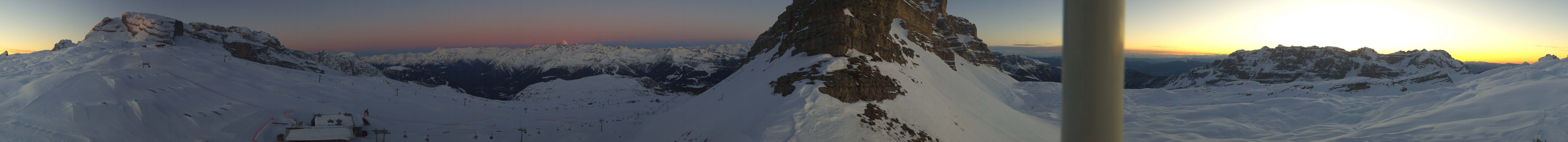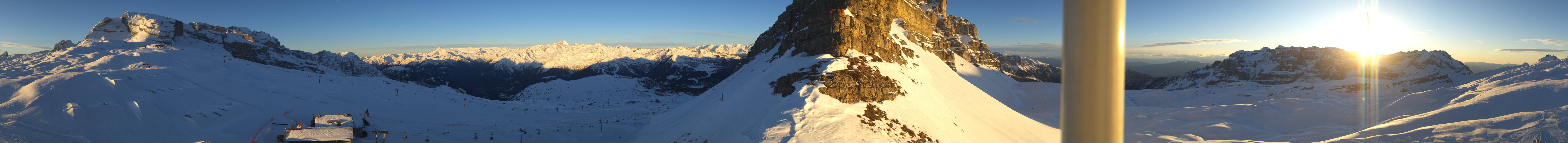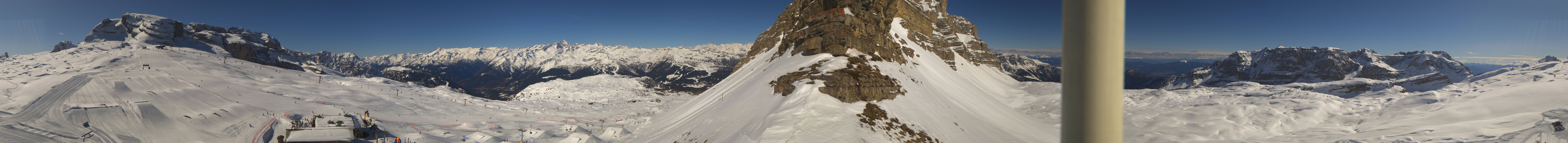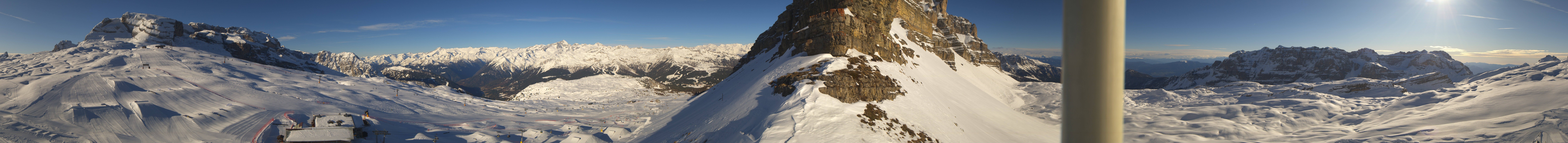 Panoramic view of the Passo Grostè in Madonna di Campiglio. You can see the Ursus Snow Park, the gondola and the chair lift Grostè Express. The mountain hut Rifugio Graffer is located below the snow park.