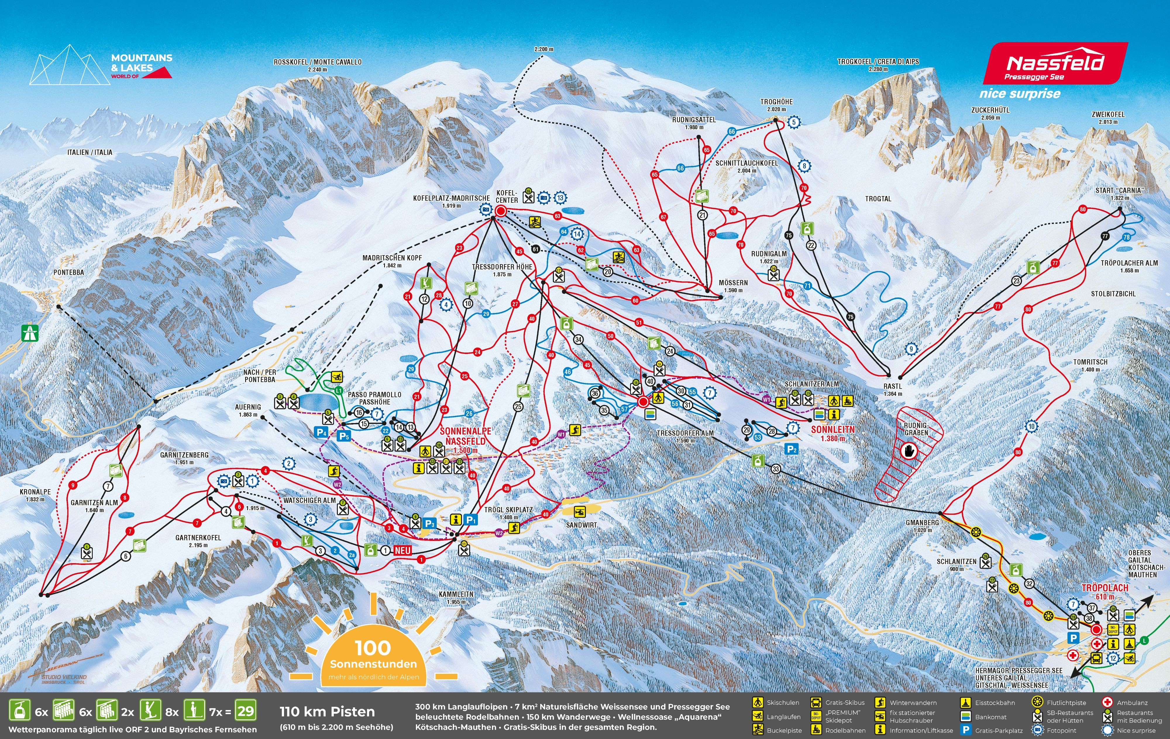 Freestylers meet at the spectacular Nassfeld Snowpark in the Gartnerkofel-Watschiger Alm area.