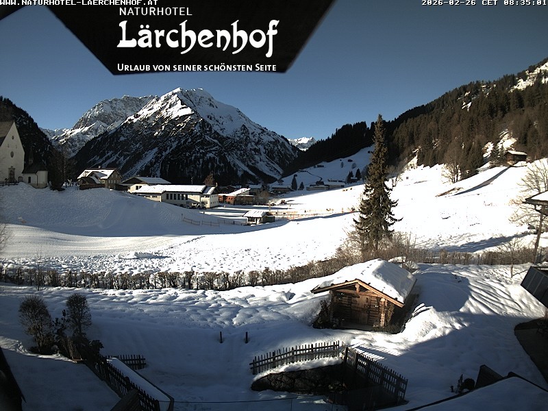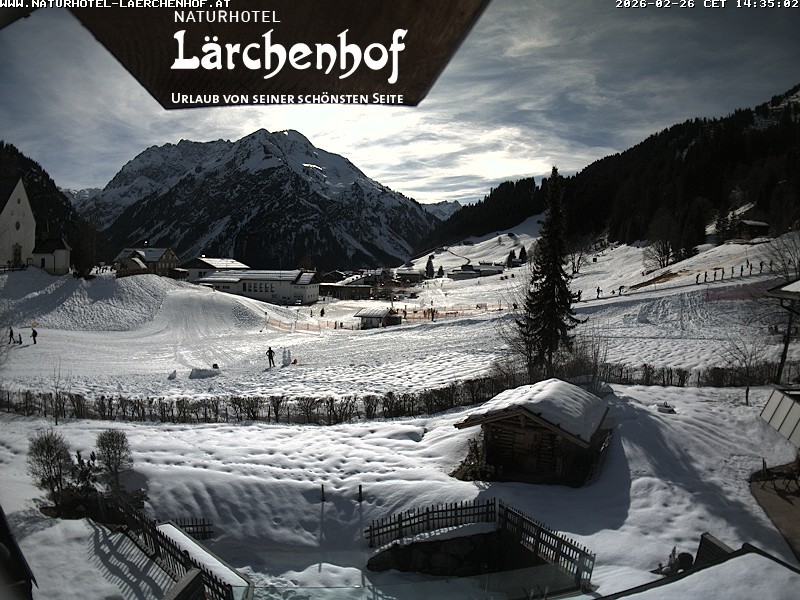 The webcam is located at Laerchenhof Nature Hotel and shows the mountain village Mittelberg in the Kleinwalsertal region.