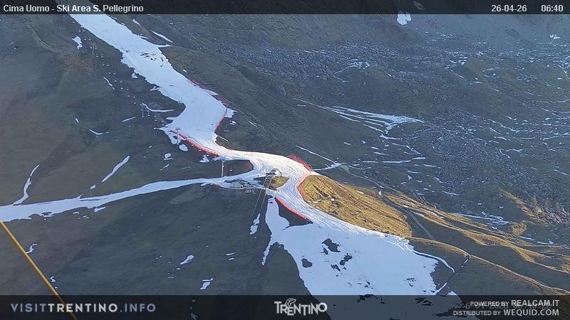 View from Col Margherita towards slopes and lifts of San Pellegrino Pass in italian Valley Fassa. From the pass, one can spot the peaks of Costabella an Cima Uomo.