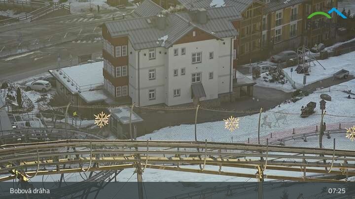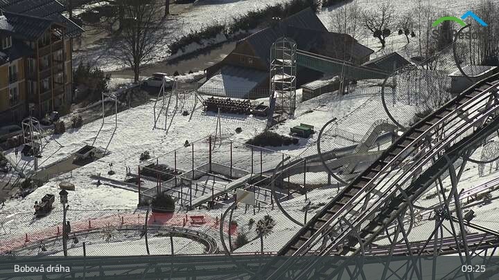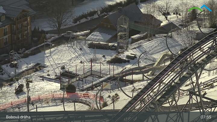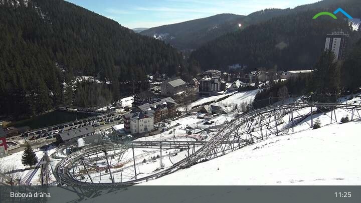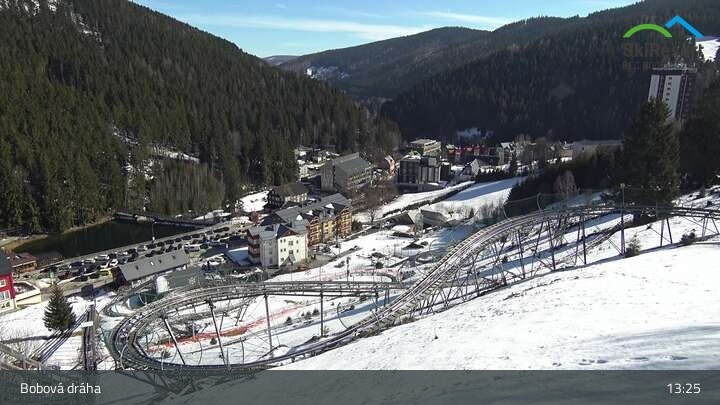 Webcam located at Bobová dráha in ski resort Pec Pod Snezkou, Czech Republic. You can see the toboggan run and the relax park.