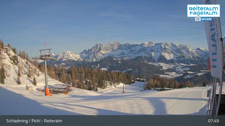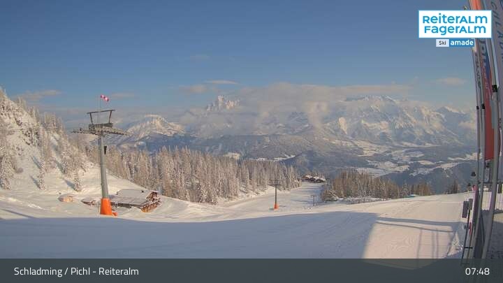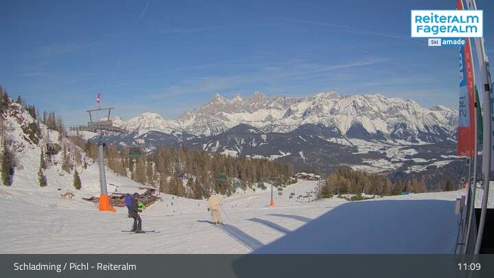 The webcam is located at the mountain station of Preunegg lift in the Reiteralm ski resort and shows the intermediate slope number 5.