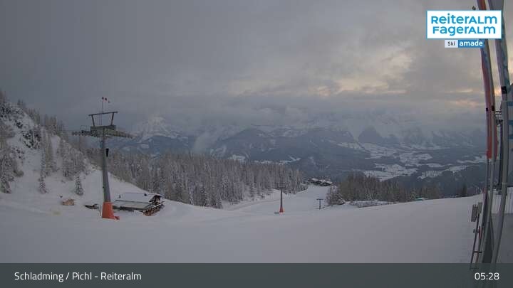 Archived webcam image showing Reiteralm - Preunegg Jet top station on 28 Mar 2026 at 05:44 04:00