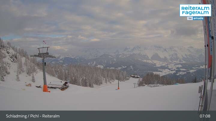 Archived webcam image showing Reiteralm - Preunegg Jet top station on 28 Mar 2026 at 07:44 06:00