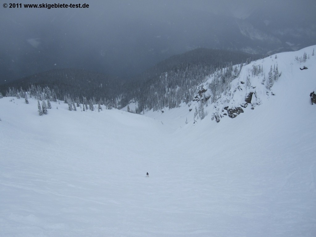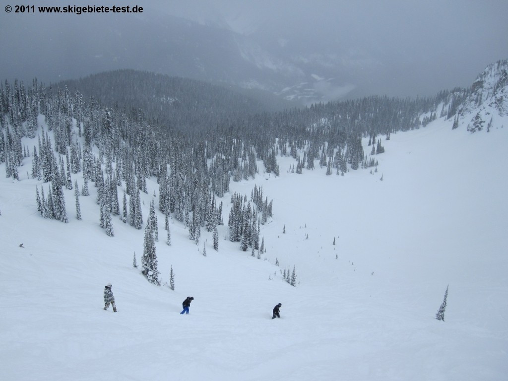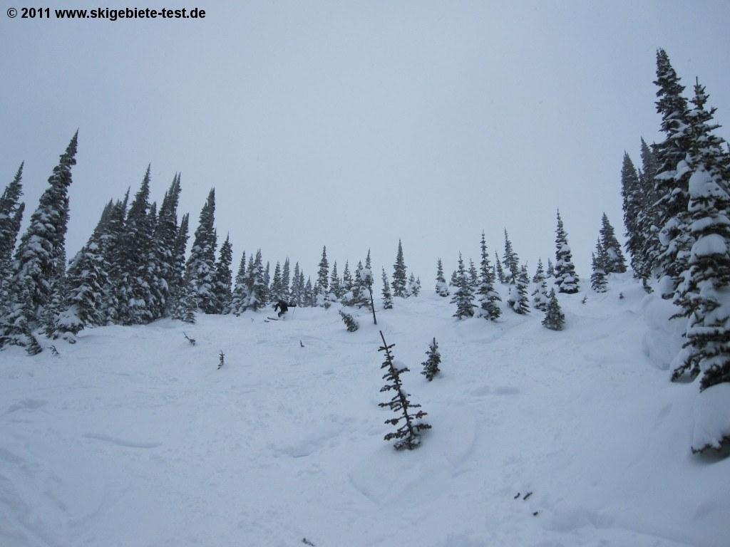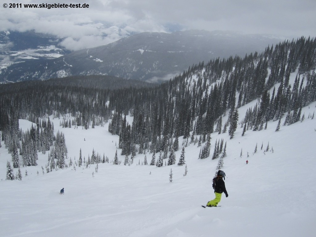 For any snowboarder who loves a challenge, Revelstoke is the place to be. “Greely Bowl” and “Gracias Ridge” in the North Bowl Area, and the “Jalapeno” trail are the perfect playgrounds for the athletic boarder (more detailed information can be found in the category “Experts & Freeriders”). And intermediate boarders are well-served here as well. The fast and modern lifts at Revelstoke all have footrests (not very common in Canada), making the trip up the mountain a much more comfortable one. We recommend intermediate boarders check out the lower sections of the intermediate trails “Snow Rodeo” and “Devil’s Club” as well as the trails “Chopper” and “Burn Down” off of the Ripper chairlift. If you’d like to try your hand at the glade boarding, we especially liked “Stop at the Road Glades” off the same lift as well. The “Aspen Glades” (between “Cannonball” and “Snow Rodeo”) and the “Tasty Glades” off the Stoke chair are also good options. If it’s your first time on a board, however, your selection is going to be more limited. You’ll find a magic carpet at the Mid-Mountain Lodge to help get you started, but apart from that, there really isn’t much for beginners. The two green trails “The Last Spike” and “Sunshine” consist to a great extent of cat tracks, which forces beginning boarders to have to try their luck at intermediate trails fairly quickly. Unfortunately, there is no terrain park at Revelstoke, but its large off-piste areas do help make up for that deficiency. Quite a few natural obstacles can be found in the “Beauty Glades” which make a park full of artificial ones seem a little redundant. “Gracias Ridge” in the “North Bowl Area” supplies boarders with nice cliffs and extremely varied terrain. So if a terrain park is not one of your requirements, and you’ve moved out of the beginners’ ranks, “Revy” might be just your cup of tea.