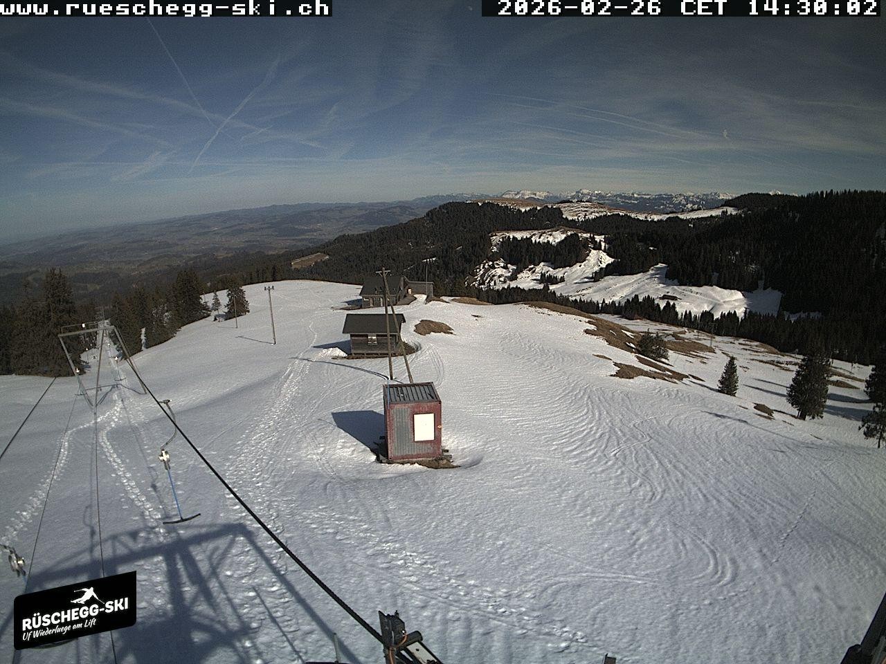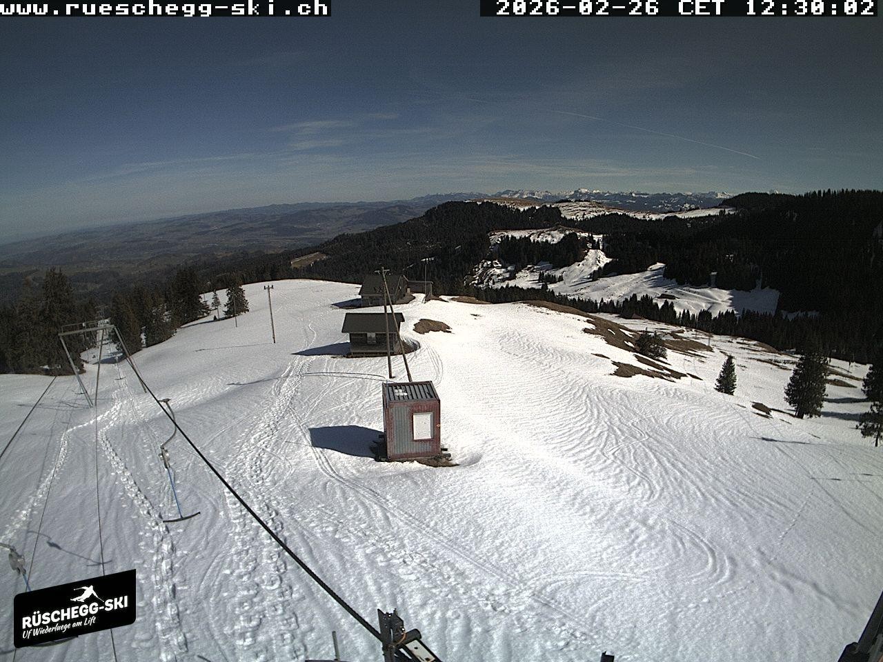 Archived webcam image showing View at the upper station Lischboden / Ski resort Rüschegg on 26 Feb 2026 at 12:56 11:00